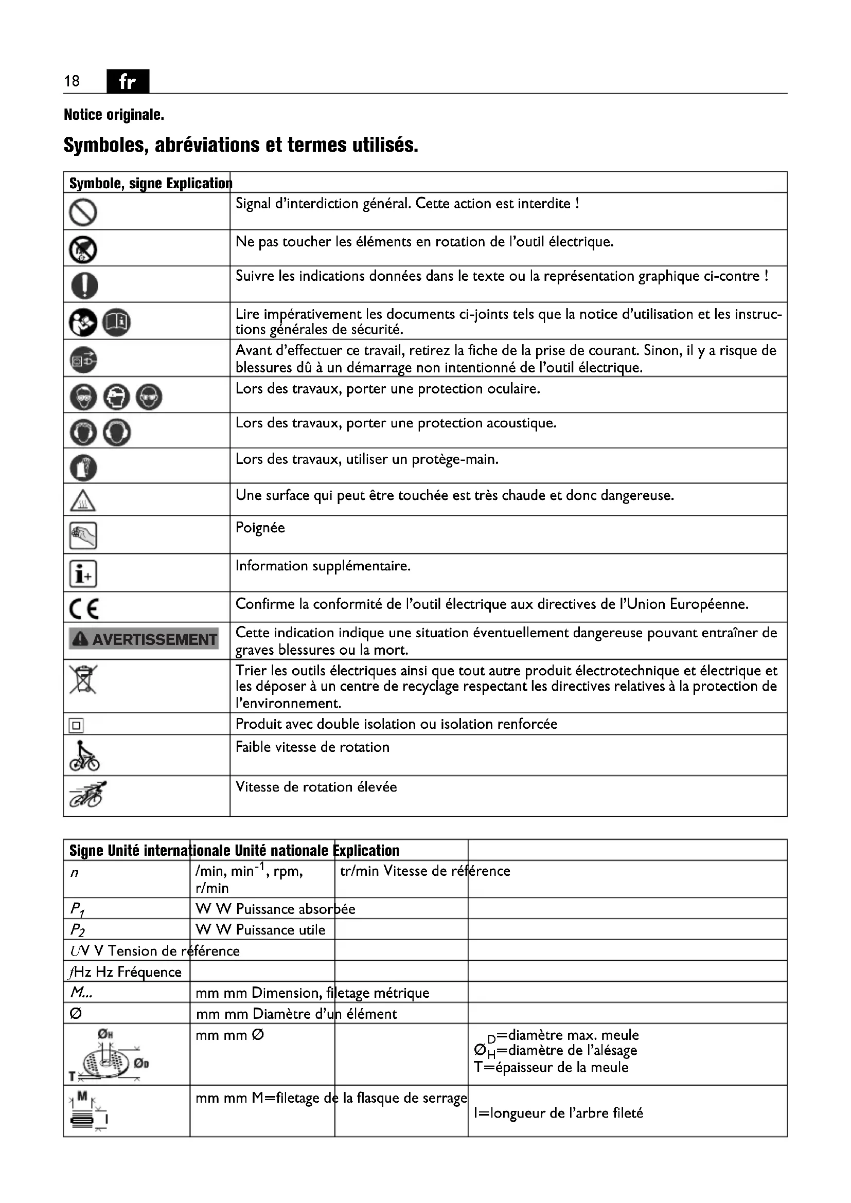Notice originale. Symboles, abréviations et termes utilisés. Symbole, signe Explication Signal d’interdiction général. Cette action est interdite ! Ne pas toucher les éléments en rotation de l’outil électrique. Suivre les indications données dans le texte ou la représentation graphique ci-contre ! Lire impérativement les documents ci-joints tels que la notice d’utilisation et les instruc- tions générales de sécurité. Avant d’effectuer ce travail, retirez la fiche de la prise de courant. Sinon, il y a risque de blessures dû à un démarrage non intentionné de l’outil électrique. Lors des travaux, porter une protection oculaire. Lors des travaux, porter une protection acoustique. Lors des travaux, utiliser un protège-main. Une surface qui peut être touchée est très chaude et donc dangereuse. Poignée Information supplémentaire. Confirme la conformité de l’outil électrique aux directives de l’Union Européenne. Cette indication indique une situation éventuellement dangereuse pouvant entraîner de graves blessures ou la mort. Trier les outils électriques ainsi que tout autre produit électrotechnique et électrique et les déposer à un centre de recyclage respectant les directives relatives à la protection de l’environnement. Produit avec double isolation ou isolation renforcée Faible vitesse de rotation Vitesse de rotation élevée AVERTISSEMENT Signe Unité internationale Unité nationale Explication