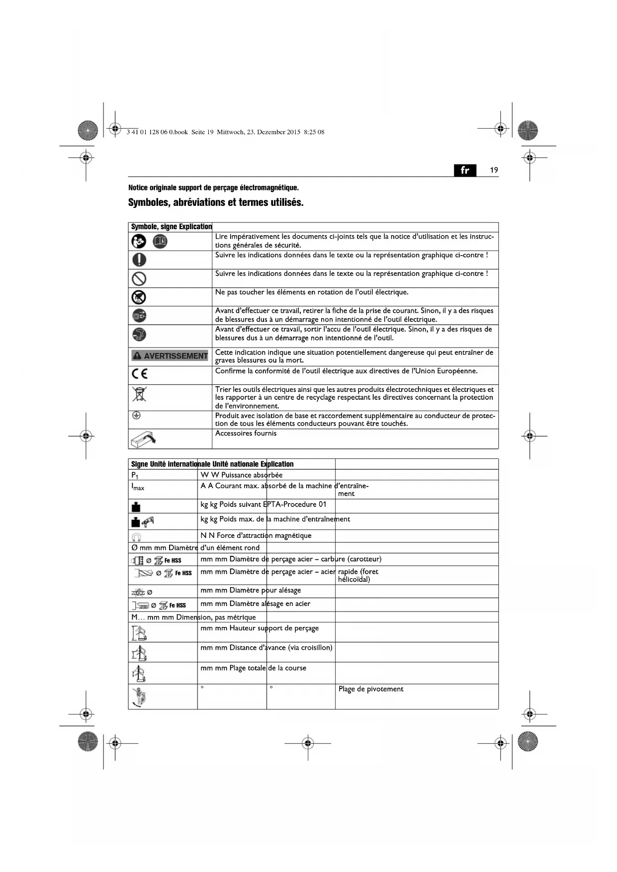 Notice originale support de perçage électromagnétique. Symboles, abréviations et termes utilisés. Symbole, signe Explication Lire impérativement les documents ci-joints tels que la notice d’utilisation et les instruc- tions générales de sécurité. Suivre les indications données dans le texte ou la représentation graphique ci-contre ! Suivre les indications données dans le texte ou la représentation graphique ci-contre ! Ne pas toucher les éléments en rotation de l’outil électrique. Avant d’effectuer ce travail, retirer la fiche de la prise de courant. Sinon, il y a des risques de blessures dus à un démarrage non intentionné de l’outil électrique. Avant d’effectuer ce travail, sortir l’accu de l’outil électrique. Sinon, il y a des risques de blessures dus à un démarrage non intentionné de l’outil. Cette indication indique une situation potentiellement dangereuse qui peut entraîner de graves blessures ou la mort. Confirme la conformité de l’outil électrique aux directives de l’Union Européenne. Trier les outils électriques ainsi que les autres produits électrotechniques et électriques et les rapporter à un centre de recyclage respectant les directives concernant la protection de l’environnement. Produit avec isolation de base et raccordement supplémentaire au conducteur de protec- tion de tous les éléments conducteurs pouvant être touchés. Accessoires fournis Signe Unité internationale Unité nationale Explication