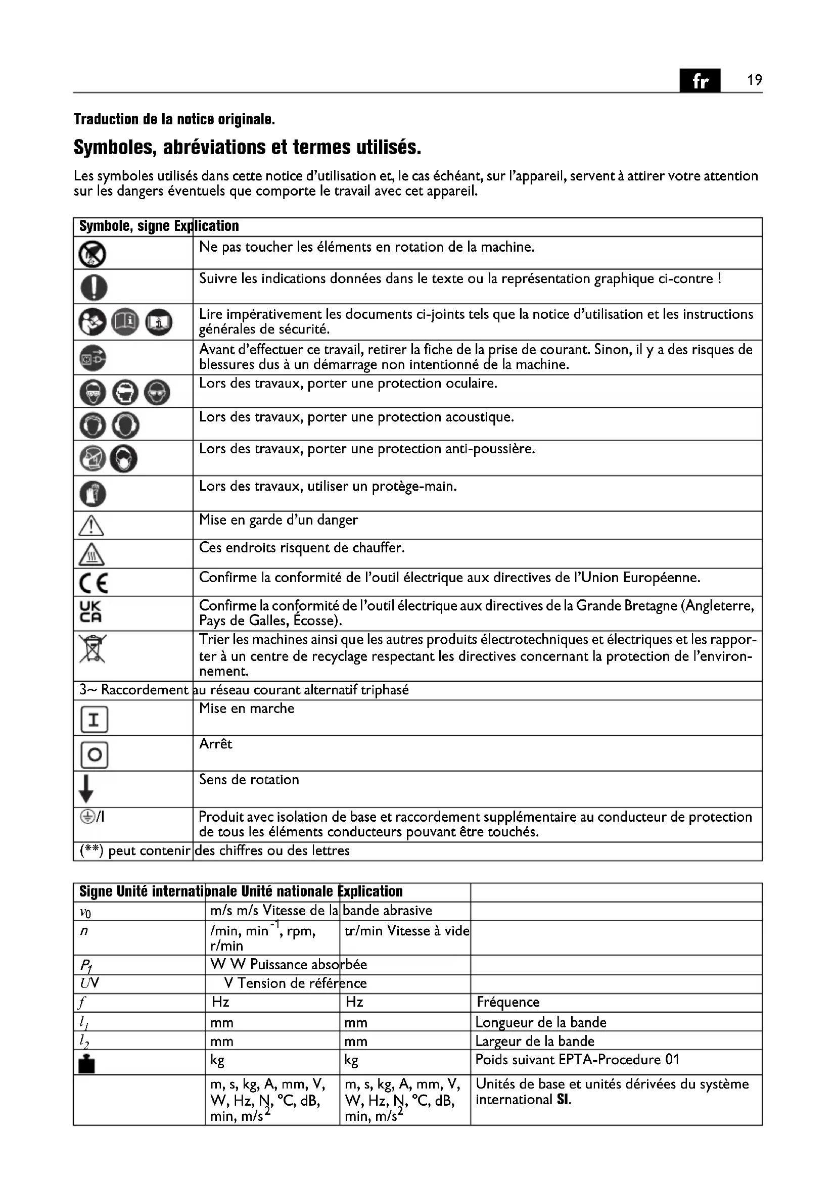 Traduction de la notice originale. Symboles, abréviations et termes utilisés. Les symboles utilisés dans cette notice d’utilisation et, le cas échéant, sur l’appareil, servent à attirer votre attention sur les dangers éventuels que comporte le travail avec cet appareil. Symbole, signe Explication Ne pas toucher les éléments en rotation de la machine. Suivre les indications données dans le texte ou la représentation graphique ci-contre ! Lire impérativement les documents ci-joints tels que la notice d’utilisation et les instructions générales de sécurité. Avant d’effectuer ce travail, retirer la fiche de la prise de courant. Sinon, il y a des risques de blessures dus à un démarrage non intentionné de la machine. Lors des travaux, porter une protection oculaire. Lors des travaux, porter une protection acoustique. Lors des travaux, porter une protection anti-poussière. Lors des travaux, utiliser un protège-main. Mise en garde d’un danger Ces endroits risquent de chauffer. Confirme la conformité de l’outil électrique aux directives de l’Union Européenne. Confirme la conformité de l’outil électrique aux directives de la Grande Bretagne (Angleterre, Pays de Galles, Écosse). Trier les machines ainsi que les autres produits électrotechniques et électriques et les rappor- ter à un centre de recyclage respectant les directives concernant la protection de l’environ- nement. 3~ Raccordement au réseau courant alternatif triphasé Mise en marche Arrêt Sens de rotation /I Produit avec isolation de base et raccordement supplémentaire au conducteur de protection de tous les éléments conducteurs pouvant être touchés. (**) peut contenir des chiffres ou des lettres Signe Unité internationale Unité nationale Explication