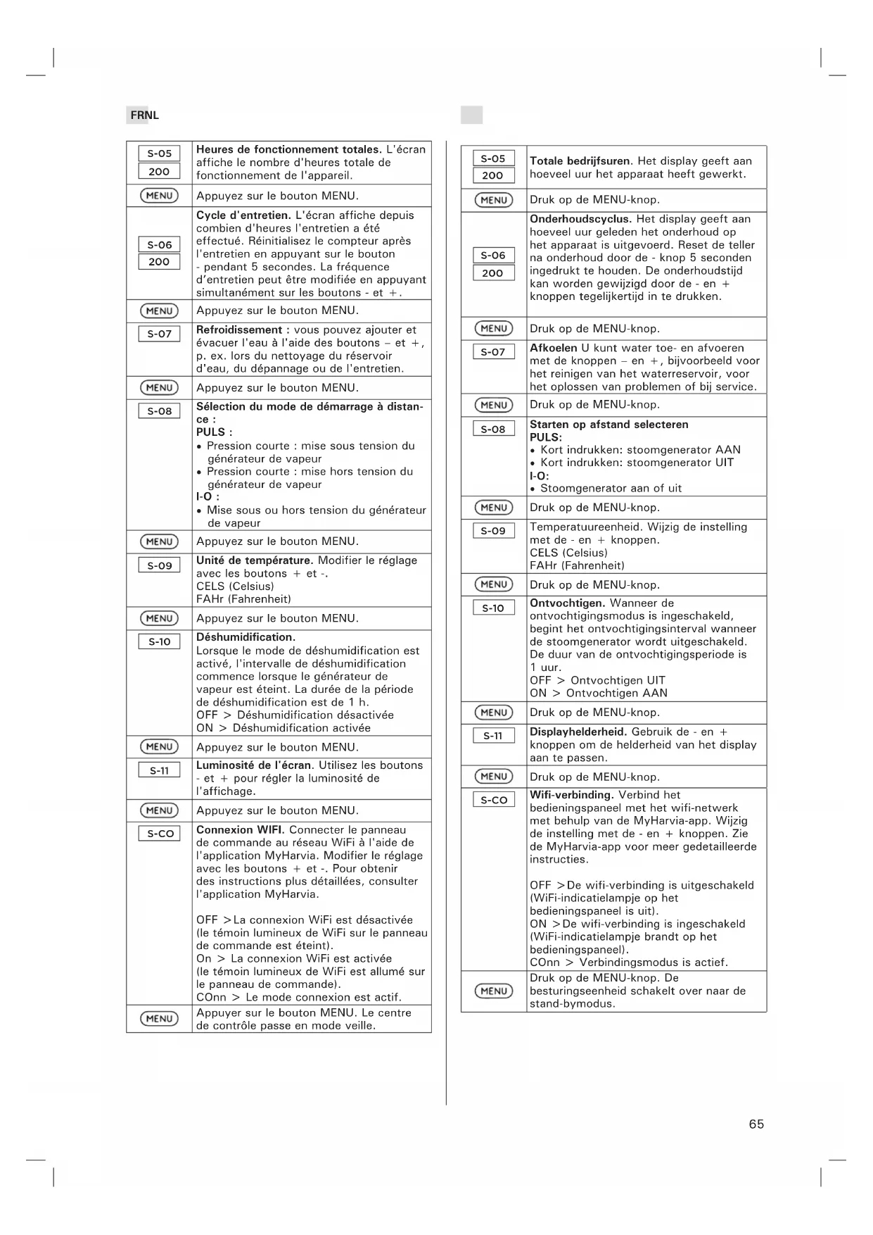 - Mise sous ou hors tension du générateur de vapeur Appuyez sur le bouton MENU. S-09 Unité de température. Modifier le réglage avec les boutons + et -. CELS (Celsius) FAHr (Fahrenheit) Appuyez sur le bouton MENU. S-10 Déshumidification. Lorsque le mode de déshumidification est activé, l'intervalle de déshumidification commence lorsque le générateur de vapeur est éteint. La durée de la période de déshumidification est de 1 h. OFF > Déshumidification désactivée ON > Déshumidification activée Appuyez sur le bouton MENU. S-11 Luminosité de l'écran. Utilisez les boutons - et + pour régler la luminosité de l'affichage. Appuyez sur le bouton MENU. S-CO Connexion WIFI. Connecter le panneau de commande au réseau WiFi à l'aide de l'application MyHarvia. Modifier le réglage avec les boutons + et -. Pour obtenir des instructions plus détaillées, consulter l'application MyHarvia. OFF >La connexion WiFi est désactivée (le témoin lumineux de WiFi sur le panneau de commande est éteint). On > La connexion WiFi est activée (le témoin lumineux de WiFi est allumé sur le panneau de commande). COnn > Le mode connexion est actif. Appuyer sur le bouton MENU. Le centre de contrôle passe en mode veille. S-05