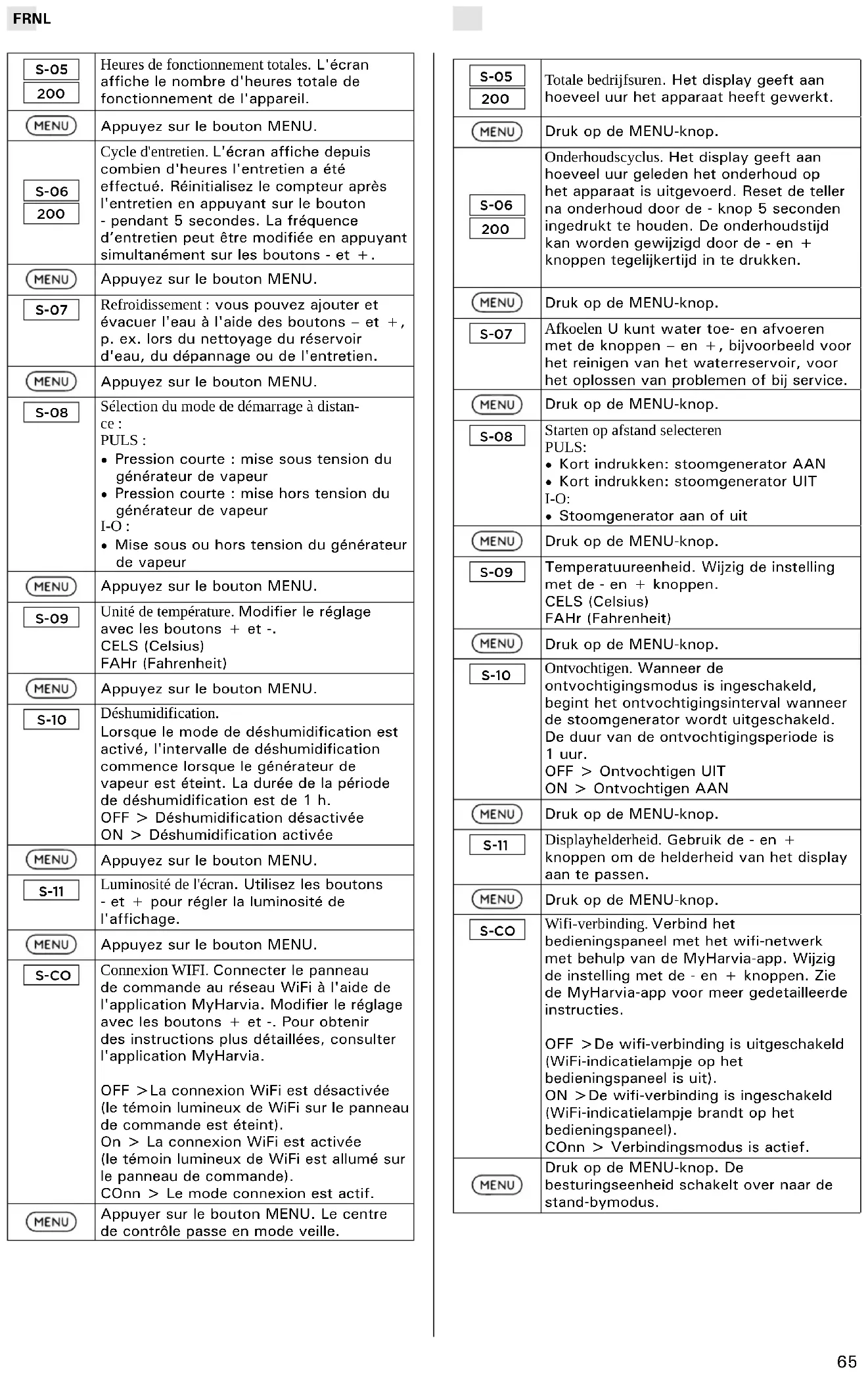 - Mise sous ou hors tension du générateur de vapeur Appuyez sur le bouton MENU. S-09 Unité de température. Modifier le réglage avec les boutons + et -. CELS (Celsius) FAHr (Fahrenheit) Appuyez sur le bouton MENU. S-10 Déshumidification. Lorsque le mode de déshumidification est activé, l'intervalle de déshumidification commence lorsque le générateur de vapeur est éteint. La durée de la période de déshumidification est de 1 h. OFF > Déshumidification désactivée ON > Déshumidification activée Appuyez sur le bouton MENU. S-11 Luminosité de l'écran. Utilisez les boutons - et + pour régler la luminosité de l'affichage. Appuyez sur le bouton MENU. S-CO Connexion WIFI. Connecter le panneau de commande au réseau WiFi à l'aide de l'application MyHarvia. Modifier le réglage avec les boutons + et -. Pour obtenir des instructions plus détaillées, consulter l'application MyHarvia. OFF >La connexion WiFi est désactivée (le témoin lumineux de WiFi sur le panneau de commande est éteint). On > La connexion WiFi est activée (le témoin lumineux de WiFi est allumé sur le panneau de commande). COnn > Le mode connexion est actif. Appuyer sur le bouton MENU. Le centre de contrôle passe en mode veille. S-05