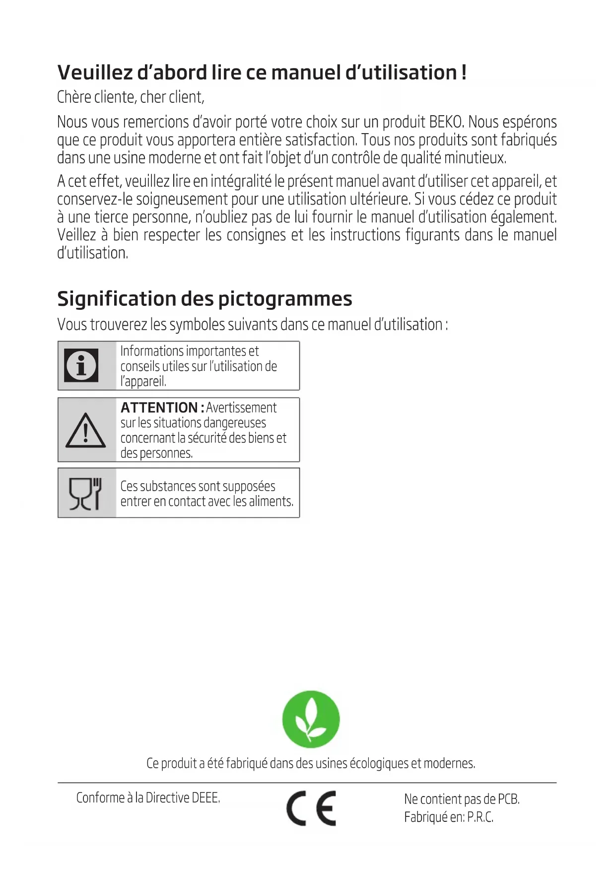 - Nos appareils électroménagers BEKO répondent aux normes de sécurité en vigueur. Par conséquent, si l’appareil ou le cordon d’alimentation est endommagé, vous devez le faire réparer ou remplacer par un centre de maintenance autorisé afin d’éviter tout danger. Des réparations défectueuses et non professionnelles peuvent être sources de danger et de risque pour l’utilisateur.