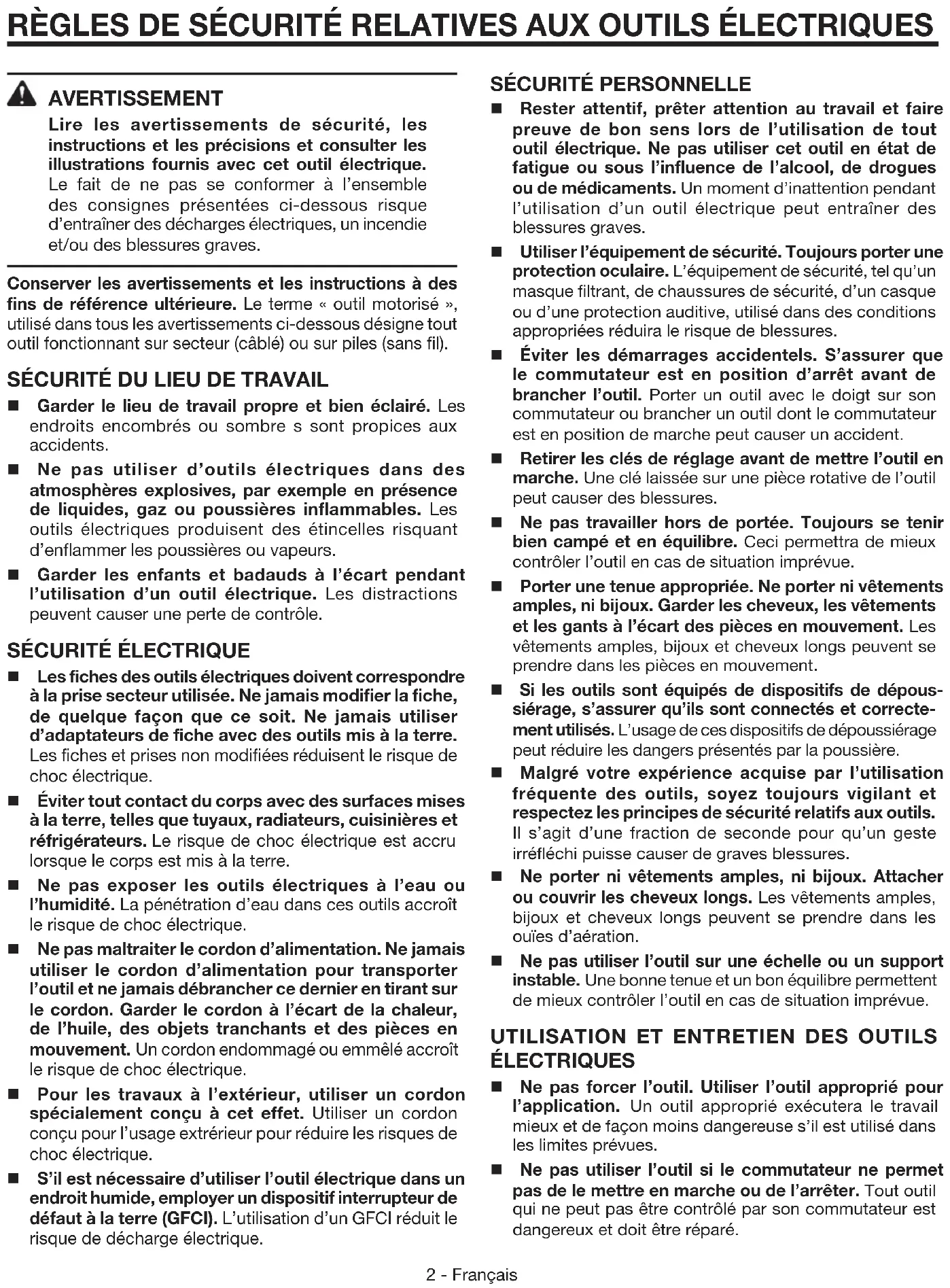 FRENCH AND SPANISH LANGUAGE SECTIONS. This product has a 90-day satisfaction guarantee policy, as well as a three-year limited warranty. For warranty and policy details, please go to www.RIDGID.com or call (toll free) 1-866-539-1710.2 - Français RÈGLES DE SÉCURITÉ RELATIVES AUX OUTILS ÉLECTRIQUES AVERTISSEMENT Lire les avertissements de sécurité, les instructions et les précisions et consulter les illustrations fournis avec cet outil électrique. Le fait de ne pas se conformer à l’ensemble des consignes présentées ci-dessous risque d’entraîner des décharges électriques, un incendie et/ou des blessures graves. Conserver les avertissements et les instructions à des fins de référence ultérieure. Le terme « outil motorisé », utilisé dans tous les avertissements ci-dessous désigne tout outil fonctionnant sur secteur (câblé) ou sur piles (sans fil).