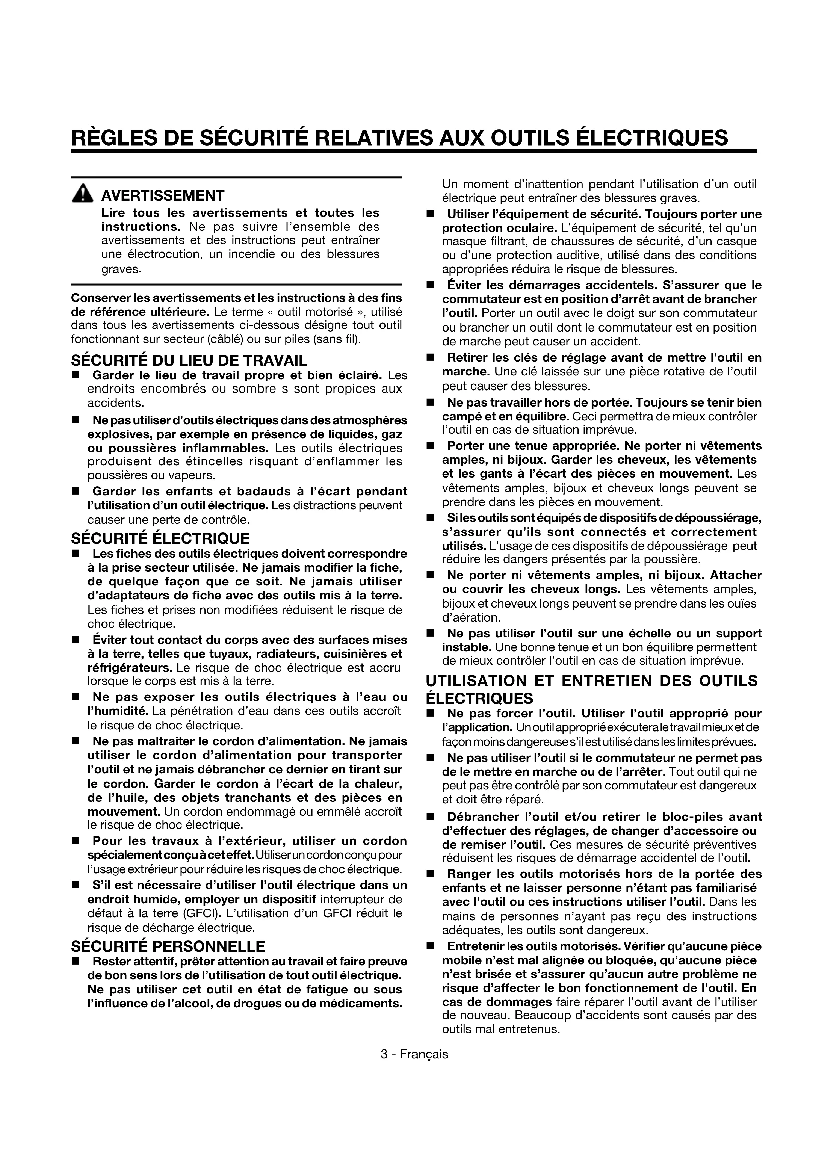 Conserver les avertissements et les instructions à des fins de référence ultérieure. Le terme « outil motorisé », utilisé dans tous les avertissements ci-dessous désigne tout outil fonctionnant sur secteur (câblé) ou sur piles (sans fil).