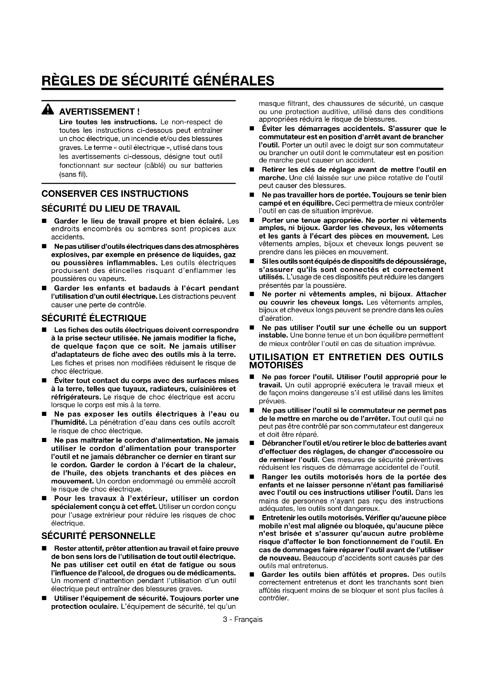 MOTORISÉS Ne pas forcer l’outil. Utiliser l’outil approprié pour le travail. Un outil approprié exécutera le travail mieux et de façon moins dangereuse s’il est utilisé dans les limites prévues. Ne pas utiliser l’outil si le commutateur ne permet pas de le mettre en marche ou de l’arrêter. Tout outil qui ne peut pas être contrôlé par son commutateur est dangereux et doit être réparé. Débrancher l’outil et/ou retirer le bloc de batteries avant d’effectuer des réglages, de changer d’accessoire ou de remiser l’outil. Ces mesures de sécurité préventives réduisent les risques de démarrage accidentel de l’outil. Ranger les outils motorisés hors de la portée des enfants et ne laisser personne n’étant pas familiarisé avec l’outil ou ces instructions utiliser l’outil. Dans les mains de personnes n’ayant pas reçu des instructions adéquates, les outils sont dangereux. Entretenir les outils motorisés. Vérifier qu’aucune pièce mobile n’est mal alignée ou bloquée, qu’aucune pièce n’est brisée et s’assurer qu’aucun autre problème risque d’affecter le bon fonctionnement de l’outil. En cas de dommages faire réparer l’outil avant de l’utiliser de nouveau. Beaucoup d’accidents sont causés par des outils mal entretenus. Garder les outils bien affûtés et propres. Des outils correctement entretenus et dont les tranchants sont bien affûtés risquent moins de se bloquer et sont plus faciles à contrôler.4 - Français Lorsque l’outil est utilisé pour un travail risquant de le mettre en contact avec des fils électriques cachés ou son propre cordon d’alimentation, le tenir par les surfaces de prise isolées. En cas de contact avec un fil sous tension, les parties métalliques exposées de l’outil seraient électrifées, exposant l’opérateur à un risque de choc électrique. Apprendre à connaître l’outil. Lire attentivement le manuel d’utilisation. Apprendre les applications et les limites de l’outil, ainsi que les risques spécifiques relatifs à son utilisation. Le respect de cette consigne réduira les risques d’incendie, de choc électrique et de blessures graves. Toujours porter une protection oculaire certifiée conforme à la norme ANSI Z87.1. Le respect de cette règle réduira les risques de blessures graves. Protection respiratoire. Porter un masque facial ou filtrant si le travail produit de la poussière. Le respect de cette consigne réduira les risques de blessures graves. Protection auditive. Porter une protection auditive durant les périodes d’utilisation prolongée. Le respect de cette consigne réduira les risques de blessures graves. Inspecter régulièrement les cordons d’alimentation des outils et s’ils sont endommagés, les confier au centre de réparations agréé le plus proche. Toujours être conscient de l’emplacement du cordon Le respect de cette consigne réduira les risques de choc électrique et d’incendie. Vérifier l’état des pièces. Avant d’utiliser l’outil de nouveau examiner soigneusement les pièces et dispositifs de protection qui semblent endommagés afin Utiliser l’outil, les accessoires et embouts, etc., conformément à ces instrutions pour les applications pour lesquelles ils sont conçus, en tenant compte des conditions et du type de travail à exécuter. L’usage d’un outil motorisé pour des applications pour lesquelles il n’est pas conçu peut être dangereux. DÉPANNAGE Les réparations doivent être confiées à un technicien qualifié, utilisant exclusivement des pièces identiques à celles d’origine. Ceci assurera le maintien de la sécurité de l’outil. de déterminer s’ils fonctionnent correctement et s’ils remplissent les fonctions prévues. Vérifier l’alignement des pièces mobiles, s’assurer qu’aucune pièce n’est bloquée ou cassée, vérifier la fixation de chaque pièce et s’assurer qu’aucun autre problème ne risque d’affecter le bon fonctionnement de l’outil. Toute protection ou pièce endommagée doit être correctement réparée ou remplacée dans un centre de réparations agréé. Le respect de cette consigne réduira les risques de choc électrique, d’incendie et de blessures graves. S’assurer que le cordon prolongateur est en bon état. Si un cordon prolongateur est utilisé, s’assurer que sa capacité est suffisante pour supporter le courant de fonctionnement de l’outil. Un calibre de fil (A.W.G) d’au minimum 16 est recommandé pour un cordon prolongateur de 15 mètres (50 pi) maximum. L’usage d’un cordon de plus de 30 m (100 pi) est déconseillé. En cas de doute, utiliser un cordon du calibre immédiatement supérieur. Moins le numéro de calibre est élevé, plus la capacité du fil est grande. Un cordon de capacité insuffisante causerait une baisse de la tension de ligne, entraînant une perte de puissance et une surchauffe. Inspecter la pièce et retirer les clous éventuels avant d’utiliser cet outil. Le respect de cette consigne réduira les risques de blessures graves. Conserver ces instructions. Les consulter fréquemment et les utiliser pour instruire les autres utilisateurs éventuels. Si cet outil est prêté, il doit être accompagné de ces instructions. RÈGLES DE SÉCURITÉ GÉNÉRALES AVERTISSEMENT ! Pour réduire les risques de blessures, l’utilisateur doit lire et veiller à bien comprendre le manuel d’utilisation. Utiliser exclusivement des pièces identiques à celles d’origine pour les réparations. Se conformer aux instructions de la section Entretien de ce manuel. L’usage de pièces non autorisées ou le non-respect des instructions peut présenter des risques de choc électrique ou de blessures. RÈGLES DE SÉCURITÉ PARTICULIÈRES