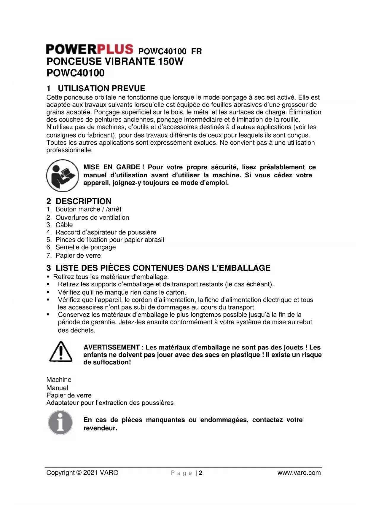 enfants ne doivent pas jouer avec des sacs en plastique ! Il existe un risque de suffocation! Machine Manuel Papier de verre Adaptateur pour l’extraction des poussières En cas de pièces manquantes ou endommagées, contactez votre revendeur.POWC40100 FR Copyright © 2021 VARO P a g e | 3 www.varo.com 4 PICTOGRAMMES Les symboles suivants sont utilisés dans ce mode d’emploi et/ou sur la machine :