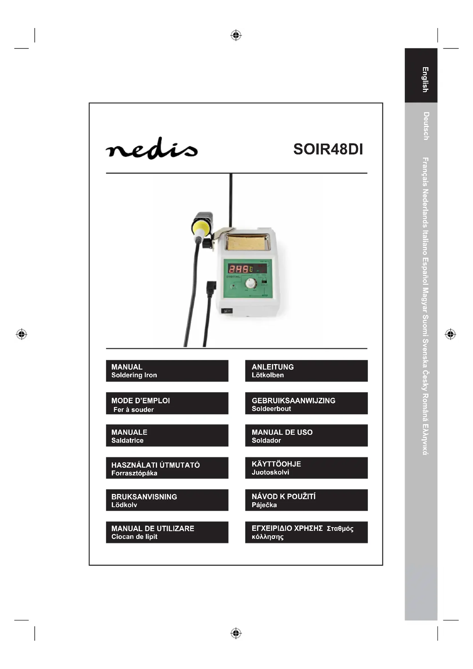FRANÇAIS Introduction : Ce fer à souder à température réglable convient pour plusieurs applications de soudage. La température réglable offre plusieurs solutions à de nombreux travaux de soudage. Utilisation : 1). Réglez la commande de température sur le niveau souhaité 2). Branchez la prise dans une che secteur (220 ~ 240 V CA) 3). Le fer à souder devient automatiquement chaud au bout d’environ 180 secondes Comment souder : 1). Nettoyez toute salissure, rouille ou peinture de la partie à souder 2). Chauffer cette partie à l’aide de la pointe du fer à souder puis mettez un peu d’étain à souder à base de résine (recommandé) 3). Laissez l’étain à souder refroidir avant de déplacer l’objet Remplacer la pointe à souder : 1). Débrancher la fiche de la prise secteur et laissez le fer à souder refroidir avant de remplacer la pointe à souder 2). Retirez les deux vis qui fixent la pointe à souder 3). Remplacez la pointe à souder avec une pointe neuve (SOIR48DI) 4). Remettez les deux vis et serrez pour fixer la pointe à souder Remarque : N’utilisez que des pièces de rechange Nedis authentiquesEnglish Deutsch FrançaisNederlandsItalianoEspañolMagyarSuomiSvenskaČeskyRomânăΕλληνικά