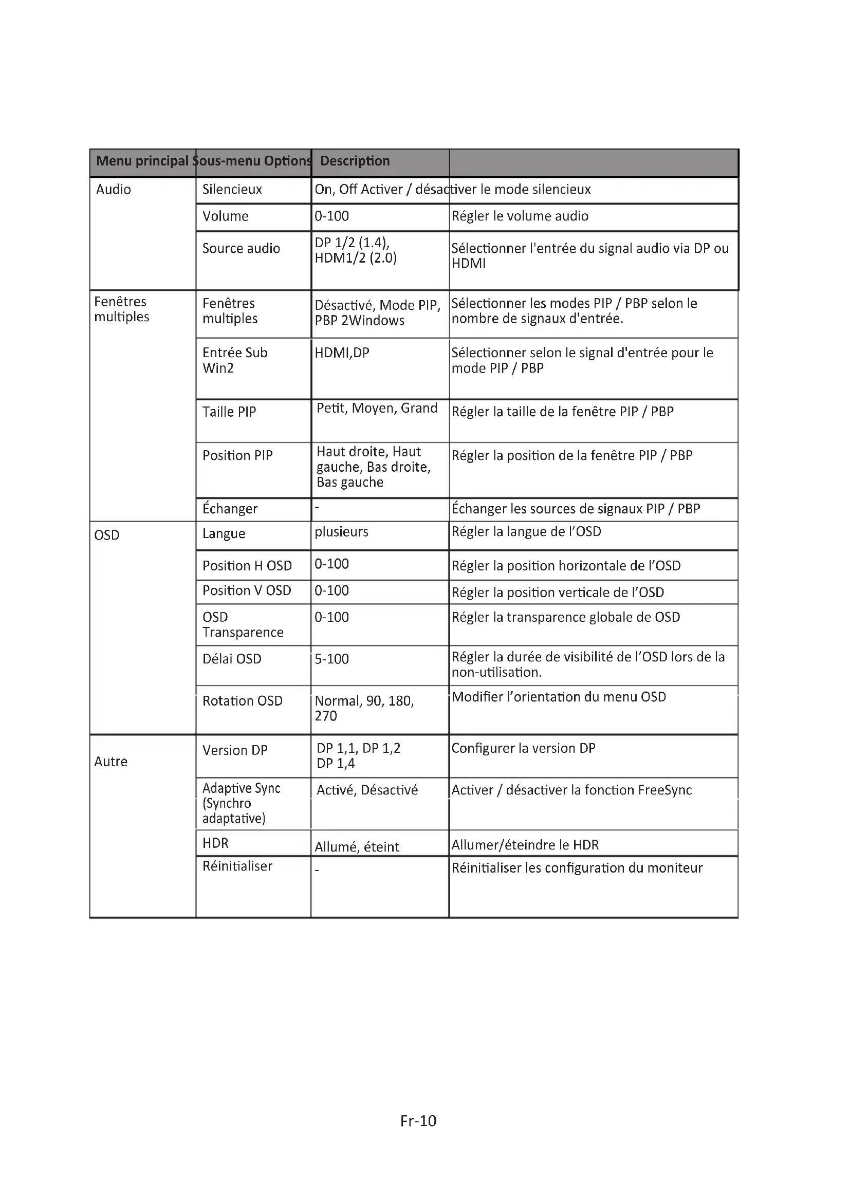 0-100 0-100 5-100 On, Off Acver / désacver le mode silencieux Régler le volume audio Séleconner l'entrée du signal audio via DP ou HDMI Séleconner les modes PIP / PBP selon le nombre de signaux d'entrée. Séleconner selon le signal d'entrée pour le mode PIP / PBP Régler la taille de la fenêtre PIP / PBP Régler la posion de la fenêtre PIP / PBP Échanger les sources de signaux PIP / PBP Régler la langue de l’OSD Régler la posion horizontale de l’OSD Régler la posion vercale de l’OSD Régler la transparence globale de OSD Régler la durée de visibilité de l’OSD lors de la non-ulisaon. Acver / désacver la foncon FreeSync Réinialiser les configuraon du moniteur Modifier l’orientaon du menu OSD Audio Silencieux Volume Source audio Fenêtres mulples OSD Fenêtres mulples Entrée Sub Win2 Taille PIP Posion PIP Échanger Langue Posion H OSD Posion V OSD OSD Transparence Délai OSD Rotaon OSD Version DP Adapve Sync (Synchro adaptave) Réinialiser Allumé, éteint Allumer/éteindre le HDR HDR Autre Acvé, Désacvé DP 1,1, DP 1,2 DP 1,4 Configurer la version DPStandard Fr-11