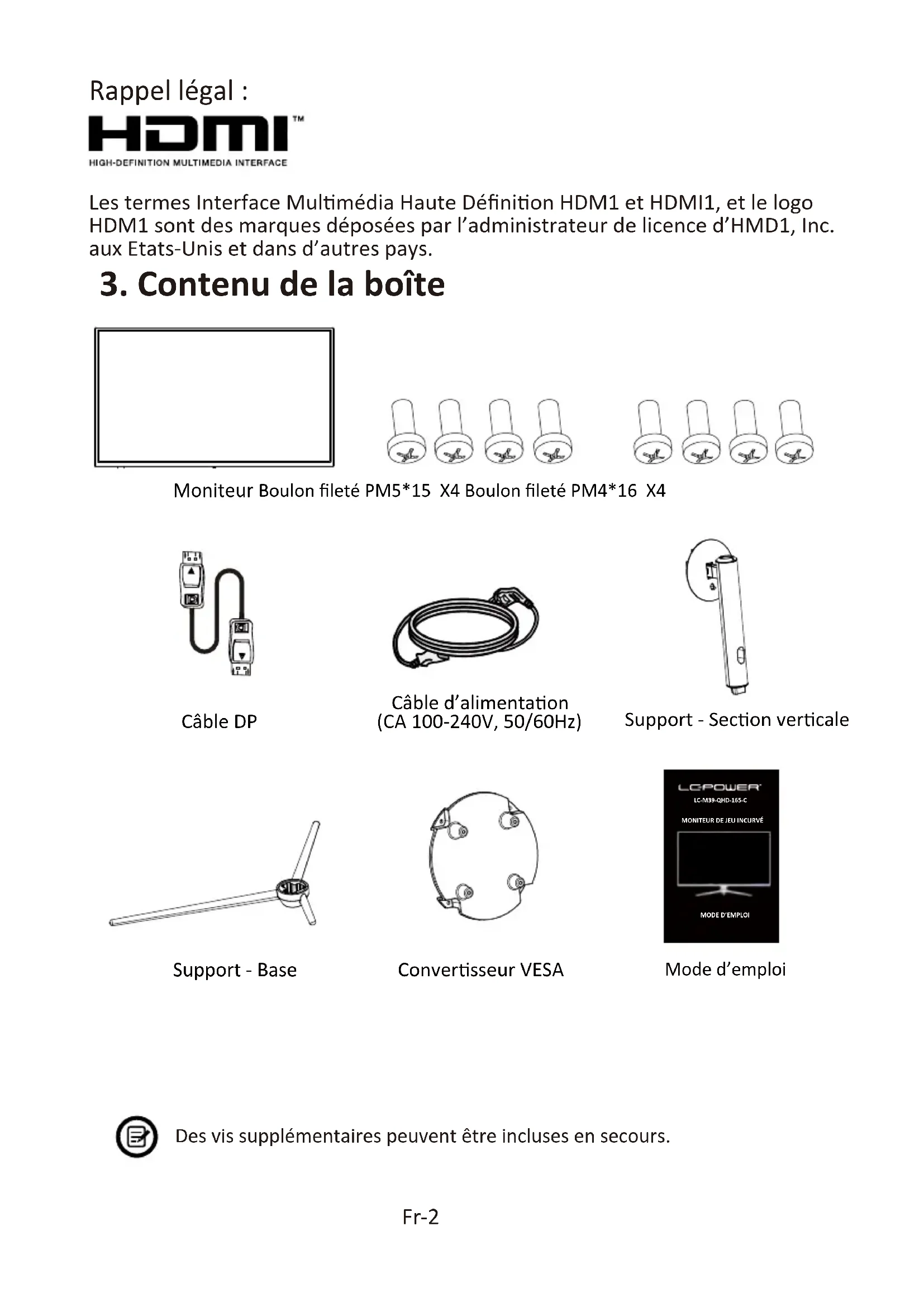 Mode d’emploiConversseur VESADes vis supplémentaires peuvent être incluses en secours.LC-M39-QHD-165-CMONITEUR DE JEU INCURVÉMODE D’EMPLOI Les termes Interface Mulmédia Haute Définion HDM1 et HDMI1, et le logo HDM1 sont des marques déposées par l’administrateur de licence d’HMD1, Inc. aux Etats-Unis et dans d’autres pays.4. Vue d’ensemble du produit