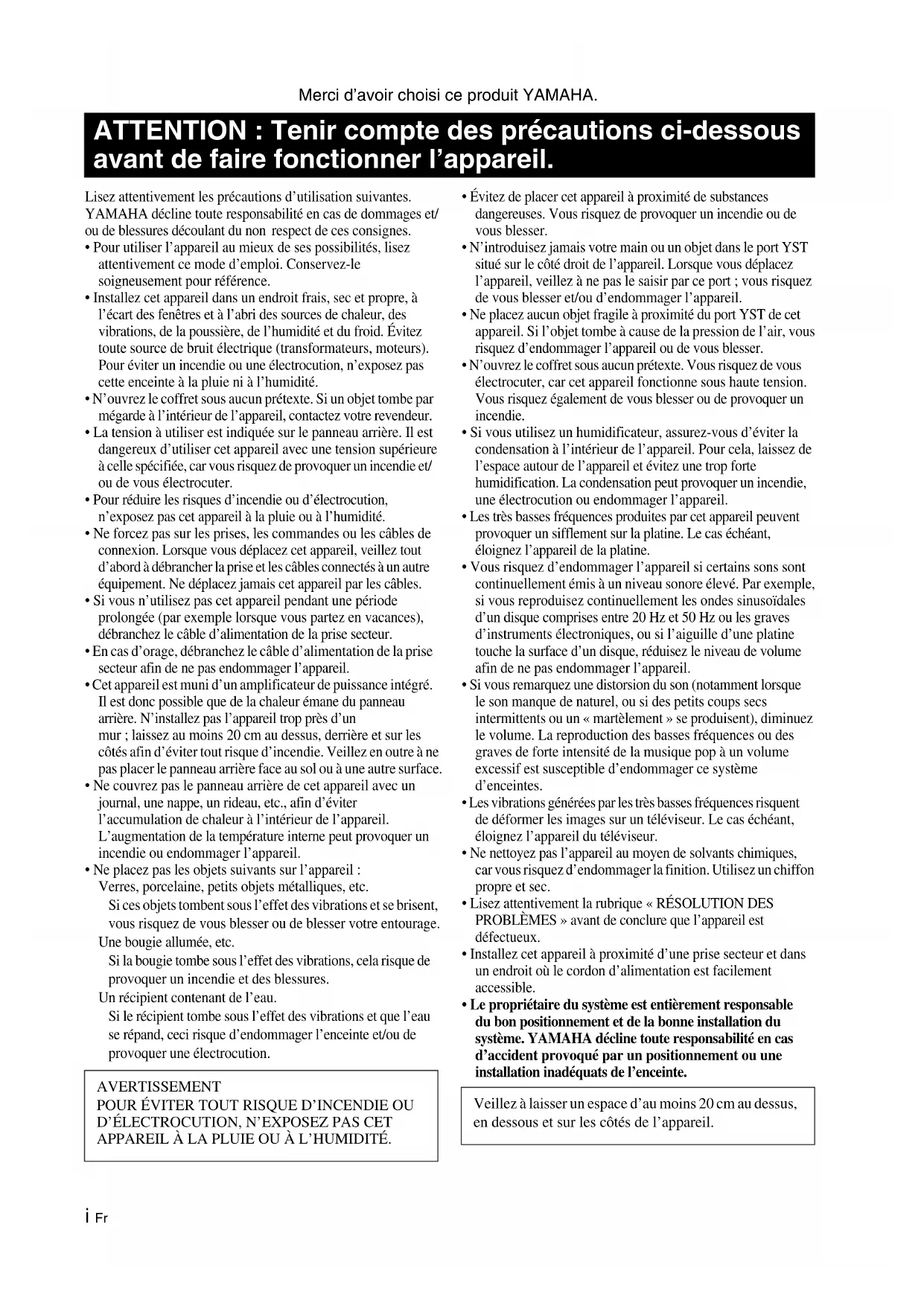 - Le propriétaire du système est entièrement responsable du bon positionnement et de la bonne installation du système. YAMAHA décline toute responsabilité en cas d’accident provoqué par un positionnement ou une installation inadéquats de l’enceinte. ATTENTION : Tenir compte des précautions ci-dessous avant de faire fonctionner l’appareil. AVERTISSEMENT POUR ÉVITER TOUT RISQUE D’INCENDIE OU