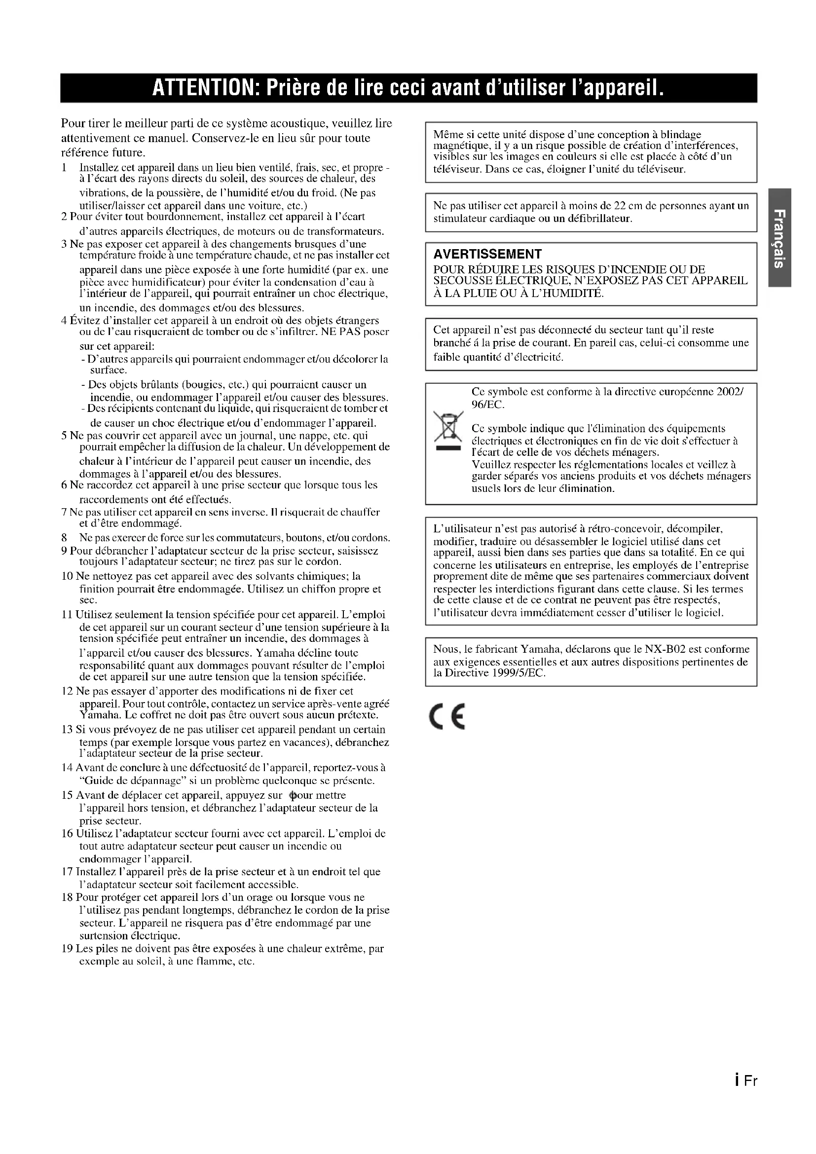 Ne pas exercer de force sur les commutateurs, boutons, et/ou cordons. 9 Pour débrancher l’adaptateur secteur de la prise secteur, saisissez toujours l’adaptateur secteur; ne tirez pas sur le cordon. 10 Ne nettoyez pas cet appareil avec des solvants chimiques; la finition pourrait être endommagée. Utilisez un chiffon propre et sec. 11 Utilisez seulement la tension spécifiée pour cet appareil. L’emploi de cet appareil sur un courant secteur d’une tension supérieure à la tension spécifiée peut entraîner un incendie, des dommages à l’appareil et/ou causer des blessures. Yamaha décline toute responsabilité quant aux dommages pouvant résulter de l’emploi de cet appareil sur une autre tension que la tension spécifiée. 12 Ne pas essayer d’apporter des modifications ni de fixer cet appareil. Pour tout contrôle, contactez un service après-vente agréé Yamaha. Le coffret ne doit pas être ouvert sous aucun prétexte. 13 Si vous prévoyez de ne pas utiliser cet appareil pendant un certain temps (par exemple lorsque vous partez en vacances), débranchez l’adaptateur secteur de la prise secteur. 14 Avant de conclure à une défectuosité de l’appareil, reportez-vous à “Guide de dépannage” si un problème quelconque se présente. 15 Avant de déplacer cet appareil, appuyez sur pour mettre l’appareil hors tension, et débranchez l’adaptateur secteur de la prise secteur. 16 Utilisez l’adaptateur secteur fourni avec cet appareil. L’emploi de tout autre adaptateur secteur peut causer un incendie ou endommager l’appareil. 17 Installez l’appareil près de la prise secteur et à un endroit tel que l’adaptateur secteur soit facilement accessible. 18 Pour protéger cet appareil lors d’un orage ou lorsque vous ne l’utilisez pas pendant longtemps, débranchez le cordon de la prise secteur. L’appareil ne risquera pas d’être endommagé par une surtension électrique. 19 Les piles ne doivent pas être exposées à une chaleur extrême, par exemple au soleil, à une flamme, etc. ATTENTION: Prière de lire ceci avant d’utiliser l’appareil. Même si cette unité dispose d’une conception à blindage magnétique, il y a un risque possible de création d’interférences, visibles sur les images en couleurs si elle est placée à côté d’un téléviseur. Dans ce cas, éloigner l’unité du téléviseur. Ne pas utiliser cet appareil à moins de 22 cm de personnes ayant un stimulateur cardiaque ou un défibrillateur. AVERTISSEMENT POUR RÉDUIRE LES RISQUES D’INCENDIE OU DE SECOUSSE ÉLECTRIQUE, N’EXPOSEZ PAS CET APPAREIL À LA PLUIE OU À L’HUMIDITÉ. Cet appareil n’est pas déconnecté du secteur tant qu’il reste branché á la prise de courant. En pareil cas, celui-ci consomme une faible quantité d’électricité. L’utilisateur n’est pas autorisé à rétro-concevoir, décompiler, modifier, traduire ou désassembler le logiciel utilisé dans cet appareil, aussi bien dans ses parties que dans sa totalité. En ce qui concerne les utilisateurs en entreprise, les employés de l’entreprise proprement dite de même que ses partenaires commerciaux doivent respecter les interdictions figurant dans cette clause. Si les termes de cette clause et de ce contrat ne peuvent pas être respectés, l’utilisateur devra immédiatement cesser d’utiliser le logiciel. Nous, le fabricant Yamaha, déclarons que le NX-B02 est conforme aux exigences essentielles et aux autres dispositions pertinentes de la Directive 1999/5/EC. Ce symbole est conforme à la directive européenne 2002/ 96/EC. Ce symbole indique que l'élimination des équipements électriques et électroniques en fin de vie doit s