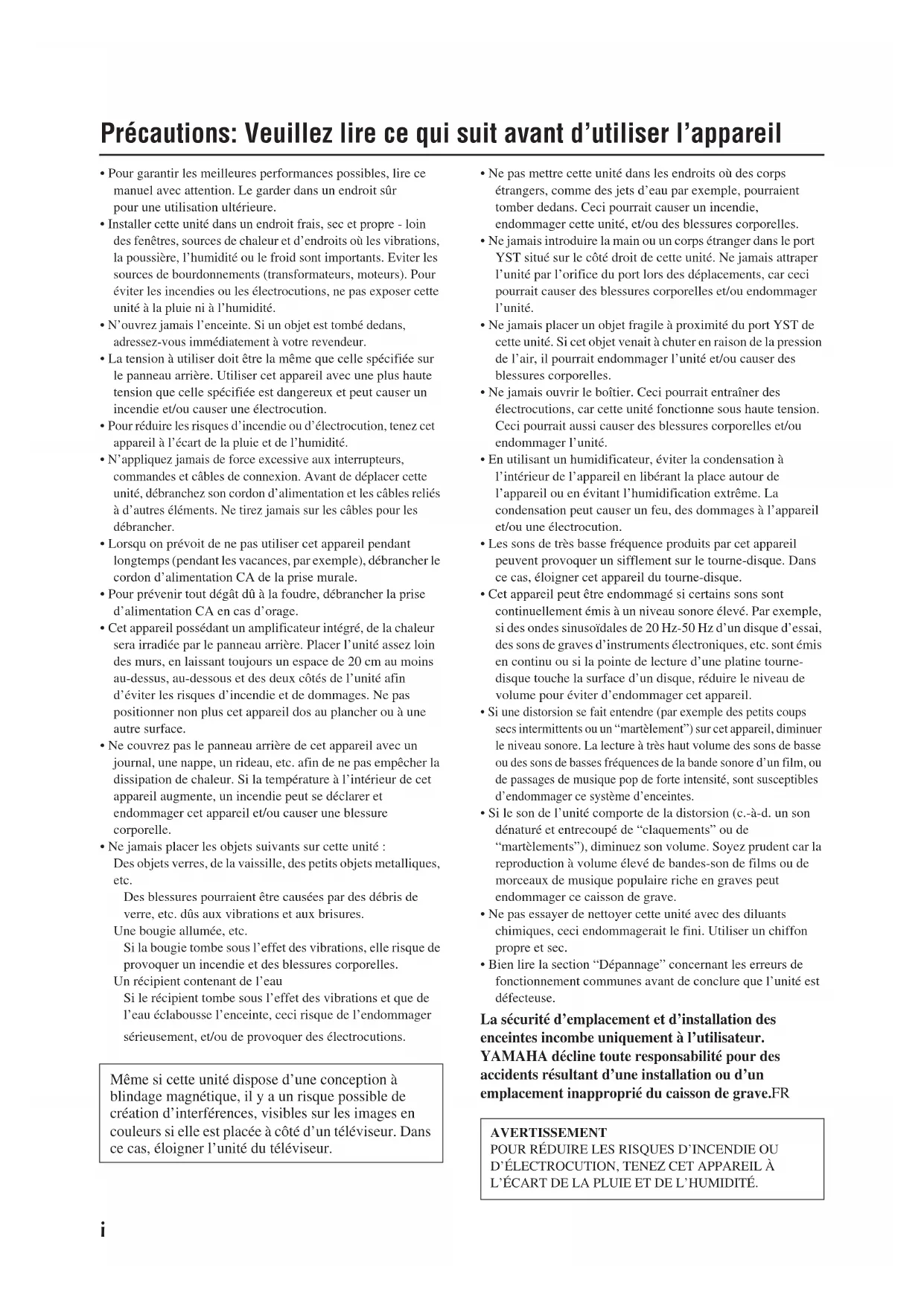 - Bien lire la section “Dépannage” concernant les erreurs de fonctionnement communes avant de conclure que l’unité est défecteuse. La sécurité d’emplacement et d’installation des enceintes incombe uniquement à l’utilisateur. YAMAHA décline toute responsabilité pour des accidents résultant d’une installation ou d’un emplacement inapproprié du caisson de grave.