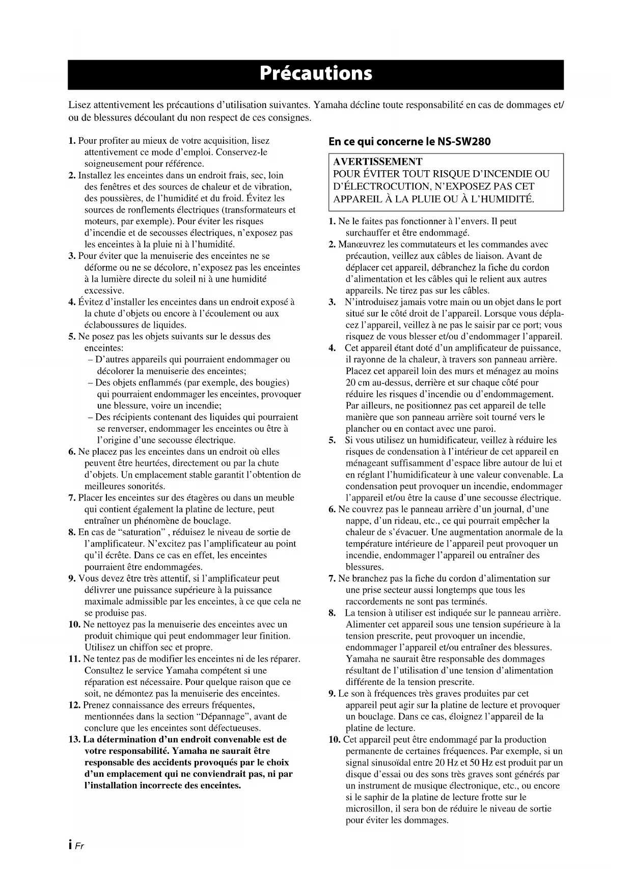 100 dBNS-SW280NS-C385 Problème Cause possible RemèdeLe commutateur POWER est en position ON mais le subwoofer ne fonctionne pas. Le câble d’alimentation n’est pas correctement raccordé.Mettez le commutateur POWER en position OFF et vérifiez si le câble d’alimentation est raccordé correctement.Pas de son. La commande VOLUME est sur Augmentez le réglage de la commande VOLUME.Le câble du subwoofer n’est pas raccordé correctement.Vérifiez si le câble du subwoofer est raccordé correctement.Le subwoofer est trop silencieux.La source contient peu de graves. Essayez avec une source contenant plus de graves.Les graves sont annulés par des ondes stationnaires.Repositionnez le subwoofer ou brisez les murs parallèles en plaçant des étagères ou d’autres objets volumineux le long du mur.6 Fr Français ■ Enceintes avant, surround (NS-B285) et enceinte centrale (NS-C385) Type NS-B285.................... Suspension acoustique pleine gammeblindage non magnétiqueNS-C385................................. Suspension acoustique 2 voiesblindage non magnétiqueHaut-parleurNS-B285...........................................................Cône de 6,5 cmNS-C385........................................Grave: Cône de 6,5 cm x 2Aigu: Dôme symétrique de 2,5 cmPuissance d’entrée nominaleNS-B285............................................................................ 30 WNS-C385............................................................................ 50 WPuissance d’entrée maximumNS-B285............................................................................ 80 WNS-C385.......................................................................... 100 W Impédance ............................................................................. 6 Ω Réponse en fréquences................................... 110 Hz–40 kHz Sensibilité NS-B285.......................................................81 dB/2,83 V, 1 m NS-C385.......................................................84 dB/2,83 V, 1 m Fréquence de transfert NS-C385........................................................................... 8 kHz Dimensions (L x H x P)NS-B285.............................90 x 90 x 109 mm (sans support)90 x 120 x 123 mm (avec support)NS-C385........................................................ 220 x 90 x 109 mmPoidsNS-B285............................................... 0,45 kg (sans support) NS-C385 .......................................................................... 1,0 kg ■ Subwoofer (NS-SW280) Type ......................Advanced Ya m a h a Active Servo Technology Haut-parleur ....................................... Grave à cône de 16 cm blindage non magnétique Puissance de sortie..............50 W (100 Hz, 5 Ω, 10% D.H.T) Puissance dynamique............................................. 100 W, 5 Ω Impédance d’entrée.......INPUT (prise RCA, 1 broche): 10 kΩ Réponse en fréquences....................................30 Hz–160 kHz Sensibilité d’entrée ................ INPUT (prise RCA, 1 broche): 80 mV (50 Hz, 50 W/5 Ω)AlimentationModèles pour les Etats-Unis et le Canada ................................................CA 120 V, 60 Hz Modèle pour l’Australie................................CA 240 V, 50 Hz Modèles pour le Royaume-Uni et l’Europe...................................................CA 230 V, 50 HzModèles pour la Chine, la Corée, l’Asie et Universel........ CA 110–120/220–240 V, 50/60 Hz Dimensions (L x H x P) ..........................262 x 264 x 316 mm Poids ................................................................................... 6,9 kg Les caractéristiques techniques sont susceptibles d’être modifiées sans préavis. Garantie Limitée pour l’Espace Économique Européenne et la Suisse Merci d’avoir porté votre choix sur un produit Yamaha. Dans l’hypothèse où vous devriez recourir au service de notre garantie après-vente, veuillez contacter votre revendeur Yamaha. Si vous rencontrez la moindre difficulté, n’hésitez pas à contacter directement Yamaha dans votre pays de résidence. Vous pouvez trouver toutes informations complémentaires sur notre site Web (http://www.yamaha-hifi.com/ ou http://www.yamaha-uk.com/ pour les résidents au Royaume-Uni). Yamaha garantit votre produit contre tout défaut de fabrication, pièces et main d’oeuvre, pour une durée de 2 ans à compter de la première date de vente au détail. Yamaha s’engage, dans les conditions décrites ci-après, à procéder à la réparation du produit défectueux (ou d’un quelconque de ses composants) ou à son remplacement à l’appréciation de Yamaha en prenant à sa charge les coûts relatifs aux pièces détachées et à la main d’oeuvre. Yamaha se réserve le droit de remplacer le produit par un modèle semblable, de par sa valeur et ses caractéristiques, dès lors que la commercialisation dudit produit a cessé ou bien lorsque sa réparation s’avère économiquement injustifiée.Conditions 1. La facture d’achat originelle ou un justificatif d’achat correspondant (indiquant la date d’achat, la référence du produit et le nom du revendeur) DOIT accompagner le produit défectueux, ainsi qu’une description précise du dysfonctionnement constaté. En l’absence de cette preuve d’achat, Yamaha se réserve le droit de refuser le service de la garantie et le produit peut être restitué aux frais du consommateur. 2. Le produit DOIT avoir été acheté par un distributeur agréé Yamaha au sein de l’Espace Economique Européen ou en Suisse.