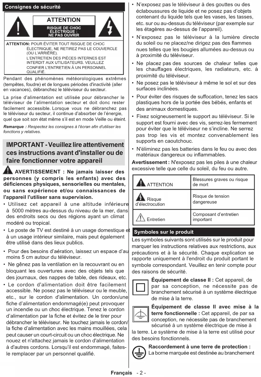 - Résolutions DVI prises en charge Français - 2 - Consignes de sécurité ATTENTION RISQUE DE CHOC ÉLECTRIQUE :NE PAS OUVRIRATTENTION: POUR ÉVITER TOUT RISQUE DE CHOC ÉLECTRIQUE, NE RETIREZ PAS LE COUVERCLE (OU L’ARRIÈRE). L’ENTRETIEN DES PIÈCES INTERNES EST INTERDIT AUX UTILISATEURS. VEUILLEZ CONFIER L'ENTRETIEN À UN PERSONNEL QUALIFIÉ. Remarque : Respectez les consignes à l'écran an d'utiliser les fonctions y relatives. Pendant des phénomènes météorologiques extrêmes (tempêtes, foudre) et de longues périodes d'inactivité (aller en vacances), débranchez le téléviseur du secteur. La prise d’alimentation est utilisée pour débrancher le téléviseur de l’alimentation secteur et doit donc rester facilement accessible. Lorsque vous ne débranchez pas le téléviseur du secteur, il continue d’absorber de l’énergie, quel que soit son état même s’il est en mode Veille ou éteint. IMPORTANT - Veuillez lire attentivement ces instructions avant d'installer ou de faire fonctionner votre appareil p. 20