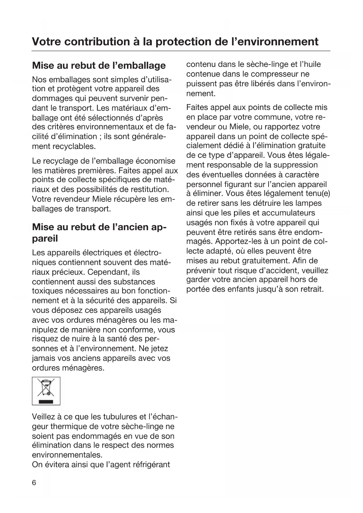 Mise au rebut de l’emballage Nos emballages sont simples d’utilisa- tion et protègent votre appareil des dommages qui peuvent survenir pen- dant le transport. Les matériaux d’em- ballage ont été sélectionnés d’après des critères environnementaux et de fa- cilité d’élimination;ils sont générale- ment recyclables. Le recyclage de l’emballage économise les matières premières. Faites appel aux points de collecte spécifiques de maté- riaux et des possibilités de restitution. Votre revendeur Miele récupère les em- ballages de transport. Mise au rebut de l’ancien ap- pareil Les appareils électriques et électro- niques contiennent souvent des maté- riaux précieux. Cependant, ils contiennent aussi des substances toxiques nécessaires au bon fonction- nement et à la sécurité des appareils. Si vous déposez ces appareils usagés avec vos ordures ménagères ou les ma- nipulez de manière non conforme, vous risquez de nuire à la santé des per- sonnes et à l’environnement. Ne jetez jamais vos anciens appareils avec vos ordures ménagères. Veillez à ce que les tubulures et l’échan- geur thermique de votre sèche-linge ne soient pas endommagés en vue de son élimination dans le respect des normes environnementales. On évitera ainsi que l’agent réfrigérant contenu dans le sèche-linge et l’huile contenue dans le compresseur ne puissent pas être libérés dans l’environ- nement. Faites appel aux points de collecte mis en place par votre commune, votre re- vendeur ou Miele, ou rapportez votre appareil dans un point de collecte spé- cialement dédié à l’élimination gratuite de ce type d’appareil. Vous êtes légale- ment responsable de la suppression des éventuelles données à caractère personnel figurant sur l’ancien appareil à éliminer. Vous êtes légalement tenu(e) de retirer sans les détruire les lampes ainsi que les piles et accumulateurs usagés non fixés à votre appareil qui peuvent être retirés sans être endom- magés. Apportez-les à un point de col- lecte adapté, où elles peuvent être mises au rebut gratuitement. Afin de prévenir tout risque d’accident, veuillez garder votre ancien appareil hors de portée des enfants jusqu’à son retrait.Consignes de sécurité et mises en garde