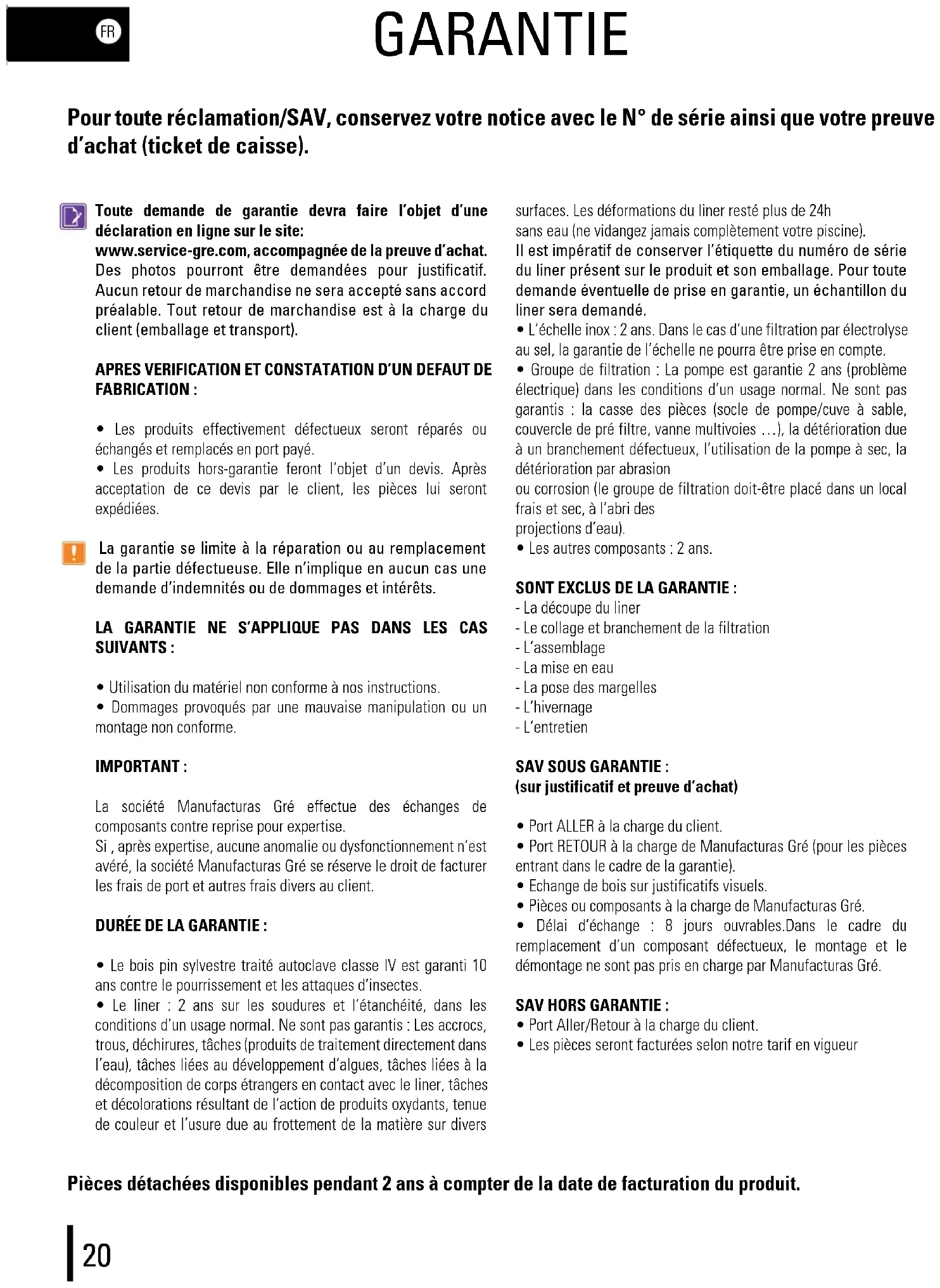 - Les autres composants : 2 ans. SONT EXCLUS DE LA GARANTIE : - La découpe du liner - Le collage et branchement de la filtration - L’assemblage - La mise en eau - La pose des margelles - L’hivernage - L’entretien SAV SOUS GARANTIE : (sur justificatif et preuve d’achat)