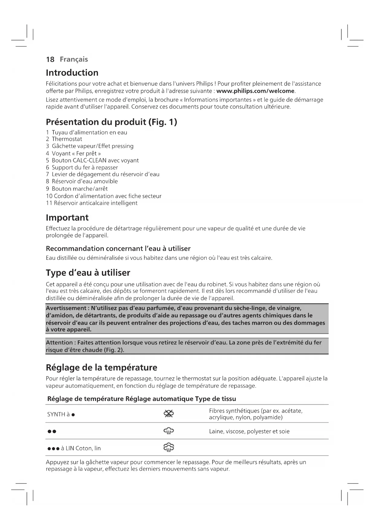 Attention: N‘interrompez pas le processus en relevant le fer du réservoir anticalcaire car de l‘eau chaude et de la vapeur sortent de la semelle. 1 Remplissez le réservoir d‘eau à moitié )Fig. 4(. Remarque: Assurez-vous que l‘appareil est branché et allumé pendant le traitement anticalcaire. 2 Placez le réservoir anticalcaire intelligent sur la planche à repasser ou sur une autre surface plane et stable. 3 Placez le fer de manière stable sur le réservoir anticalcaire )Fig. 5(. Remarque: Le réservoir anticalcaire a été conçu pour recueillir les particules de calcaire et l‘eau chaude pendant le traitement anticalcaire. Il est parfaitement sûr de poser le fer sur ce réservoir pendant tout le traitement. 4 Maintenez enfoncé le bouton Calc-Clean pendant 2secondes jusqu‘à ce que de brefssignaux sonores retentissent )Fig. 6(. 5 Pendant le traitement anticalcaire, de brefssignaux sonores retentissent, ainsi qu‘un bruit de pompe )Fig.7(. 6 Lorsque la fonction anticalcaire est terminée, le fer cesse d‘émettre des signaux sonores et le voyant CALC-CLEAN cesse de clignoter )Fig. 8(. 7 Essuyez le fer avec un chion et replacez-le sur la base )Fig. 9(. 8 Le réservoir anticalcaire devenant chaud pendant le traitement anticalcaire, patientez environ 5minutes avant de le toucher. Transportez ensuite le réservoir anticalcaire vers l‘évier, videz-le et rangez-le pour un usage ultérieur )Fig. 10(.20 Français 9 Si nécessaire, vous pouvez répéter les étapes 1 à 7. Veillez à vider le réservoir anticalcaire avant de commencer le traitement anticalcaire. Remarque: Pendant le traitement anticalcaire, de l‘eau propre peut s‘écouler de la semelle si aucun résidu de calcaire ne s‘est accumulé dans le fer. Ce phénomène est normal. Dépannage Cette rubrique récapitule les problèmes les plus courants que vous pouvez rencontrer avec l'appareil. Si vous ne parvenez pas à résoudre un problème à l'aide des renseignements ci-dessous, rendez-vous sur le site www.philips.com/support et consultez la liste des questions fréquemment posées ou contactez le ServiceConsommateursPhilips de votre pays. Problème Cause possible Solution L'appareil ne produit pas de vapeur. Vous avez réglé le thermostat sur SYNTH à 1. Réglez le thermostat sur la position 2 ou supérieure. La fonction vapeur reste désactivée jusqu'à ce que vous ayez eectué la procédure de détartrage. Eectuez la procédure de détartrage pour réactiver la fonction vapeur. )reportez-vous au chapitre «Nettoyage et entretien»( Au début de votre séance de repassage, la gâchette vapeur n'a pas été maintenue enfoncée assez longtemps. Maintenez la gâchette vapeur enfoncée jusqu'à ce que la vapeur s'échappe de l'appareil. Jusqu'à 30secondes peuvent s'écouler avant que la vapeur ne sorte. Le voyant Calc-Clean clignote. Aucune vapeur ne s'échappe de la semelle et/ou l'appareil émet un signal sonore. Vous n'avez pas exécuté ou terminé le traitement anticalcaire. Exécutez le traitement anticalcaire pour réactiver la fonction vapeur )voir le chapitre «Nettoyage et entretien»(. L'appareil s'est éteint. La fonction d‘arrêt automatique est automatiquement activée lorsque l‘appareil n‘a pas été utilisé pendant plus de 5minutes. Pour réactiver l'appareil, réglez le bouton marche/arrêt sur la position «Arrêt», puis sur la position «Marche». L'appareil recommence alors à chauer. Le fer produit un bruit de pompe. Le réservoir d'eau est vide. Remplissez le réservoir d'eau avec de l'eau et appuyez sur la gâchette vapeur jusqu'à ce que le bruit de pompe s'atténue et que de la vapeur s'échappe de la semelle. Des gouttes d'eau s'écoulent de la semelle. Après le traitement anticalcaire, de l'eau peut s'écouler de la semelle. Essuyez soigneusement la semelle à l'aide d'un chion sec. Si le voyant Calc-Clean continue de clignoter et l'appareil continue d'émettre un signal sonore, exécutez le traitement anticalcaire (voir le chapitre «Nettoyage et entretien»(. De l'eau sale et des impuretés )taches marron, particules de calcaire, etc.( s'échappent de la semelle. Des impuretés ou dépôts de calcaire se sont formés sur les évents à vapeur et/ou la semelle. Exécutez régulièrement le traitement anticalcaire )voir le chapitre «Nettoyage et entretien»(. De l'eau s'écoule de la semelle. Vous avez accidentellement démarré le traitement anticalcaire (voir le chapitre «Nettoyage et entretien»(. Éteignez l'appareil, puis rallumez-le. Laissez chauer le fer jusqu'à ce que le voyant «Fer prêt» du fer reste allumé.21 Italiano Introduzione Congratulazioni per l’acquisto e benvenuti in Philips! Per trarre il massimo vantaggio dall’assistenza fornita da Philips, registrate il vostro prodotto sul sito www.philips.com/welcome. Prima di utilizzare l’apparecchio, leggete attentamente il manuale dell'utente, l’opuscolo “Informazioni importanti” e la guida rapida. Conservateli per eventuali riferimenti futuri.