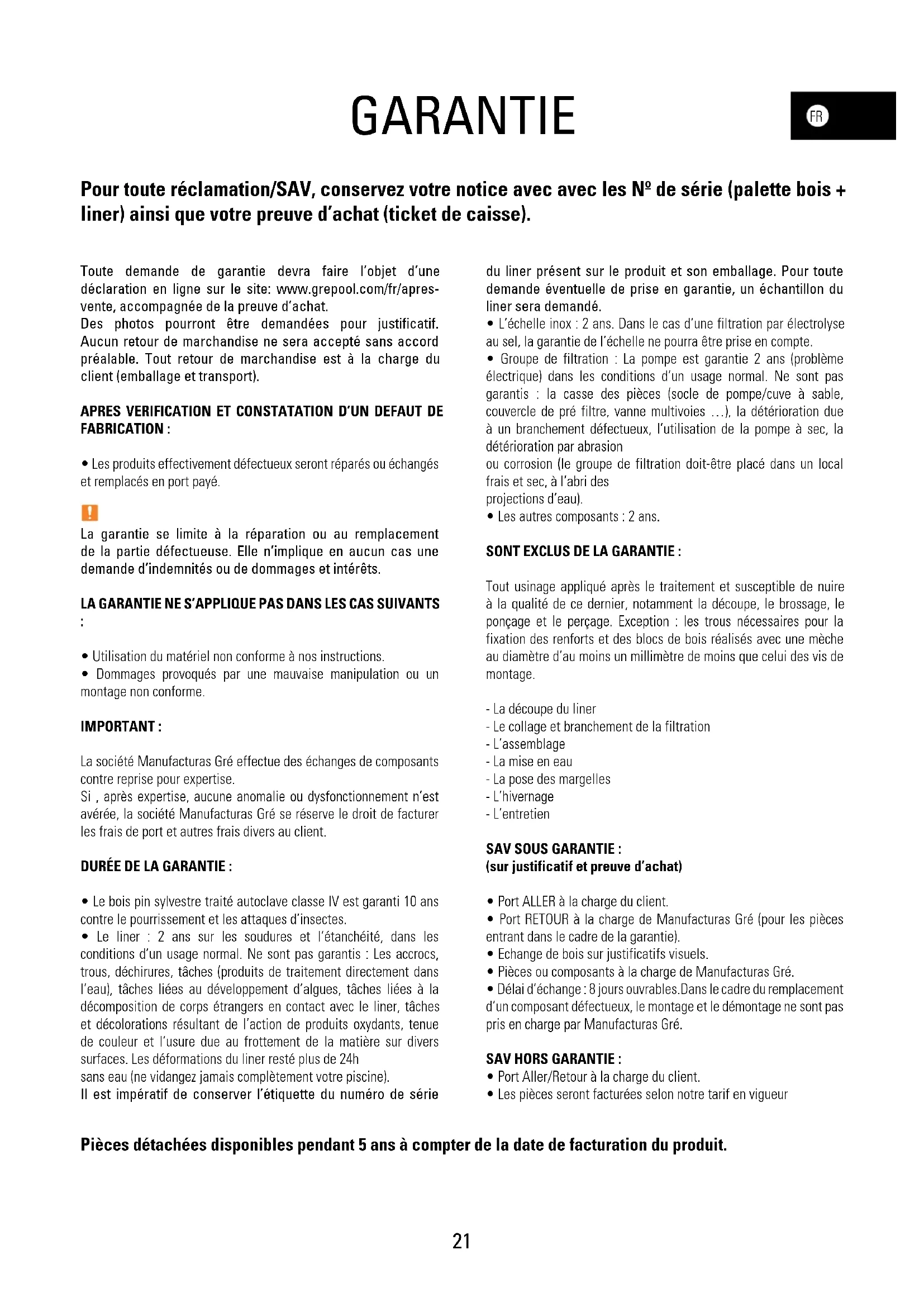 GARANTIE Pour toute réclamation/SAV, conservez votre notice avec avec les Nº de série (palette bois + liner) ainsi que votre preuve d’achat (ticket de caisse). Toute demande de garantie devra faire l’objet d’une déclaration en ligne sur le site: www.grepool.com/fr/apres- vente, accompagnée de la preuve d’achat. Des photos pourront être demandées pour justificatif. Aucun retour de marchandise ne sera accepté sans accord préalable. Tout retour de marchandise est à la charge du client (emballage et transport). APRES VERIFICATION ET CONSTATATION D’UN DEFAUT DE FABRICATION :