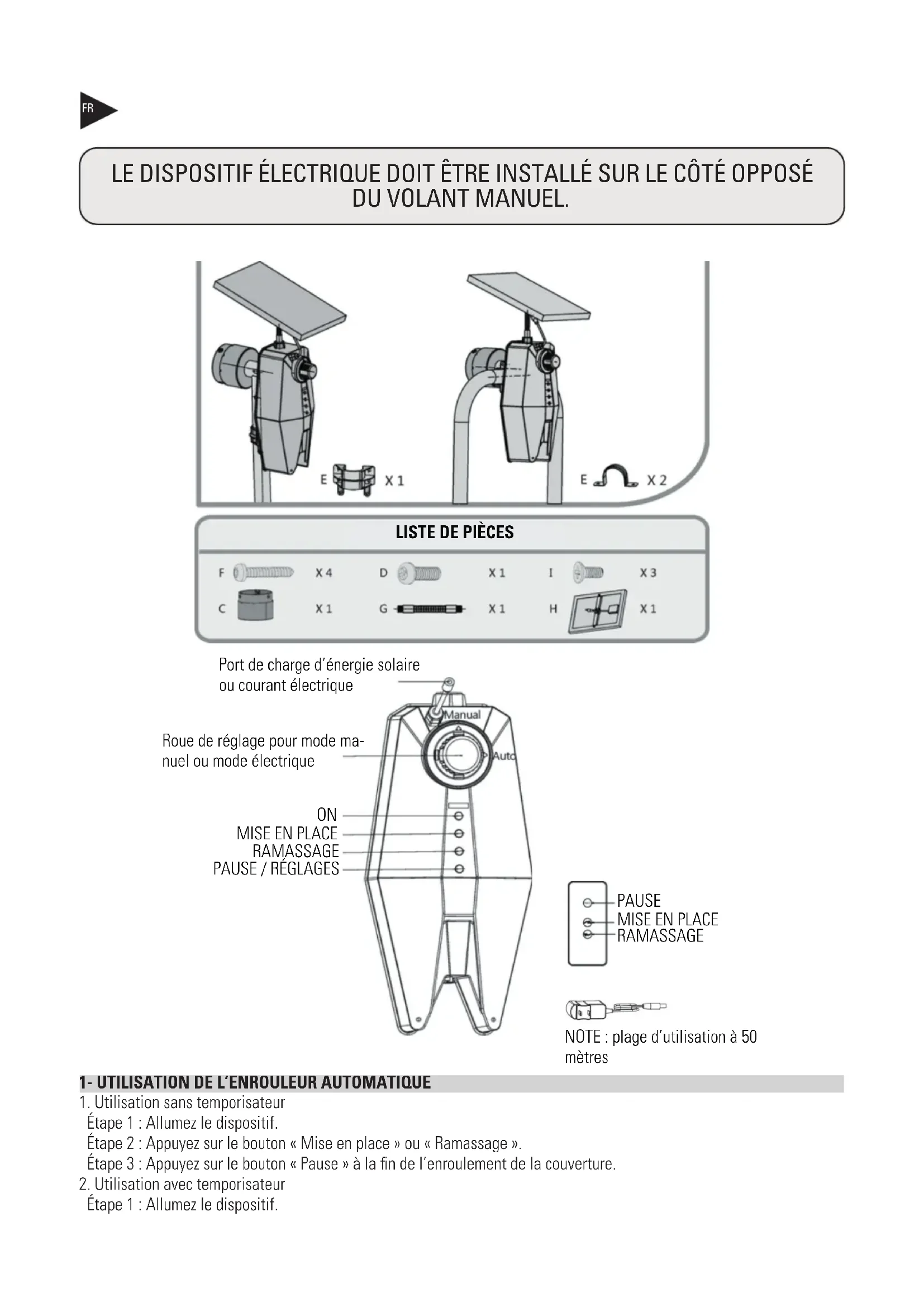 Roue de réglage pour mode ma- nuel ou mode électrique NOTE : plage d’utilisation à 50 mètres Port de charge d’énergie solaire ou courant électrique LISTE DE PIÈCESÉtape 2 : Appuyez sur le bouton « Mise en place » ou « Ramassage ». L’enrouleur s’arrête automatiquement à la fin de l’enroulement de la couverture. Il n’est pas nécessaire d’attendre et d’appuyer sur le bouton « Pause ».