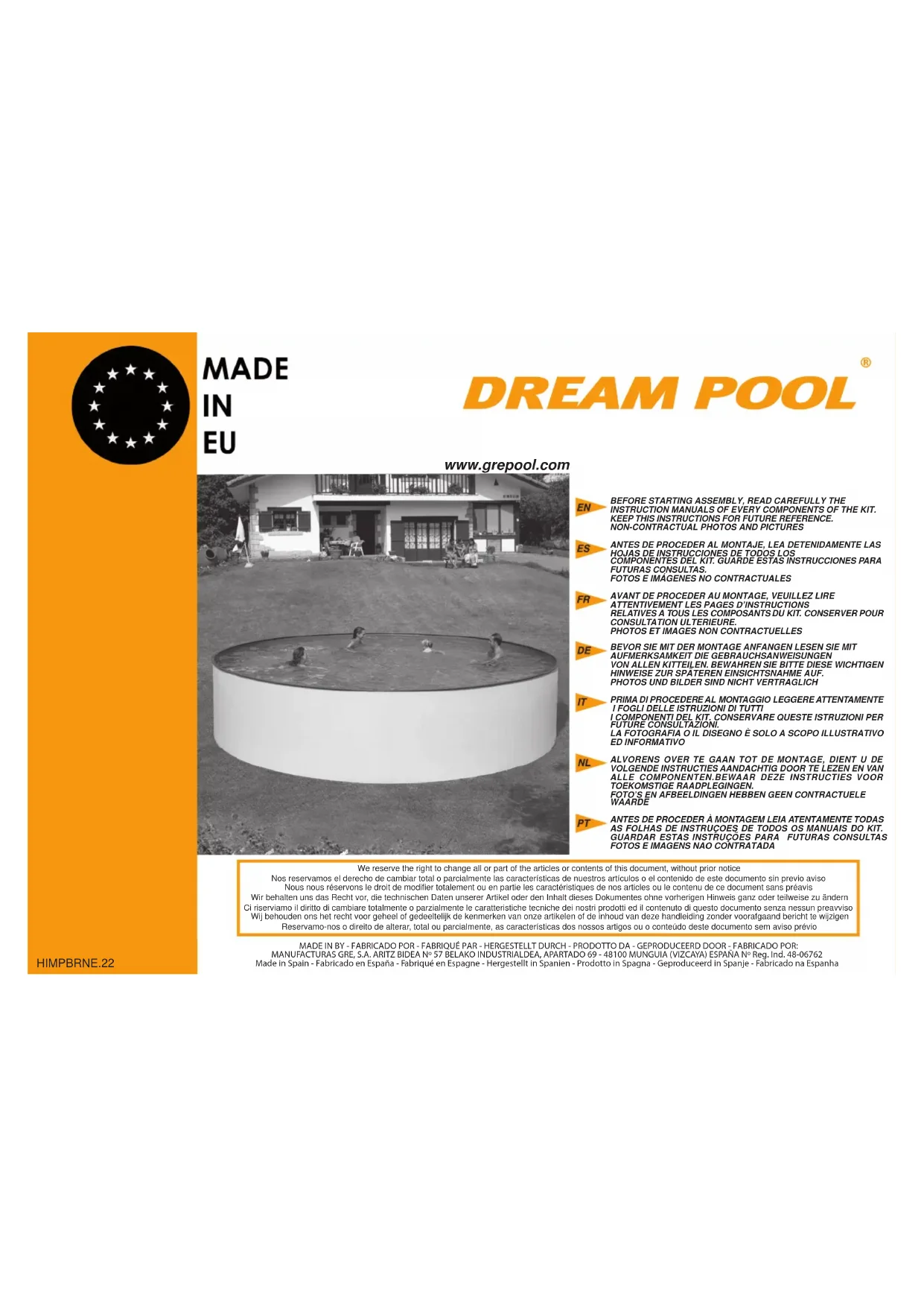 - Les autres composants : 2 ans. SONT EXCLUS DE LA GARANTIE : - La découpe du liner - Le collage et branchement de la ltration - L’assemblage - La mise en eau - La pose des margelles - L’hivernage - L’entretien GARANTIE : La garantie est valide dans les pays membres de la communauté européenne, UK et en Suisse. Gre ore à l’acheteur - en plus des droits de garantie qui lui correspondent par la loi au vendeur et sans les limiter - un droit dont les conditions des obligations garanties suivantes pour les nouveaux produits. MANUFACTURAS GRE S.A. Aritz Bidea, 57 BELAKO INDUSTRIALDEA, APARTADO 69, 48.100 - MUNGUIA (VIZCAYA) ESPAÑA. Telf.: (34) 94 674 11 16 (8 líneas) Fax: (34) 94 674 17 08 e-mail: gre@gre.es http://www.grepool.com