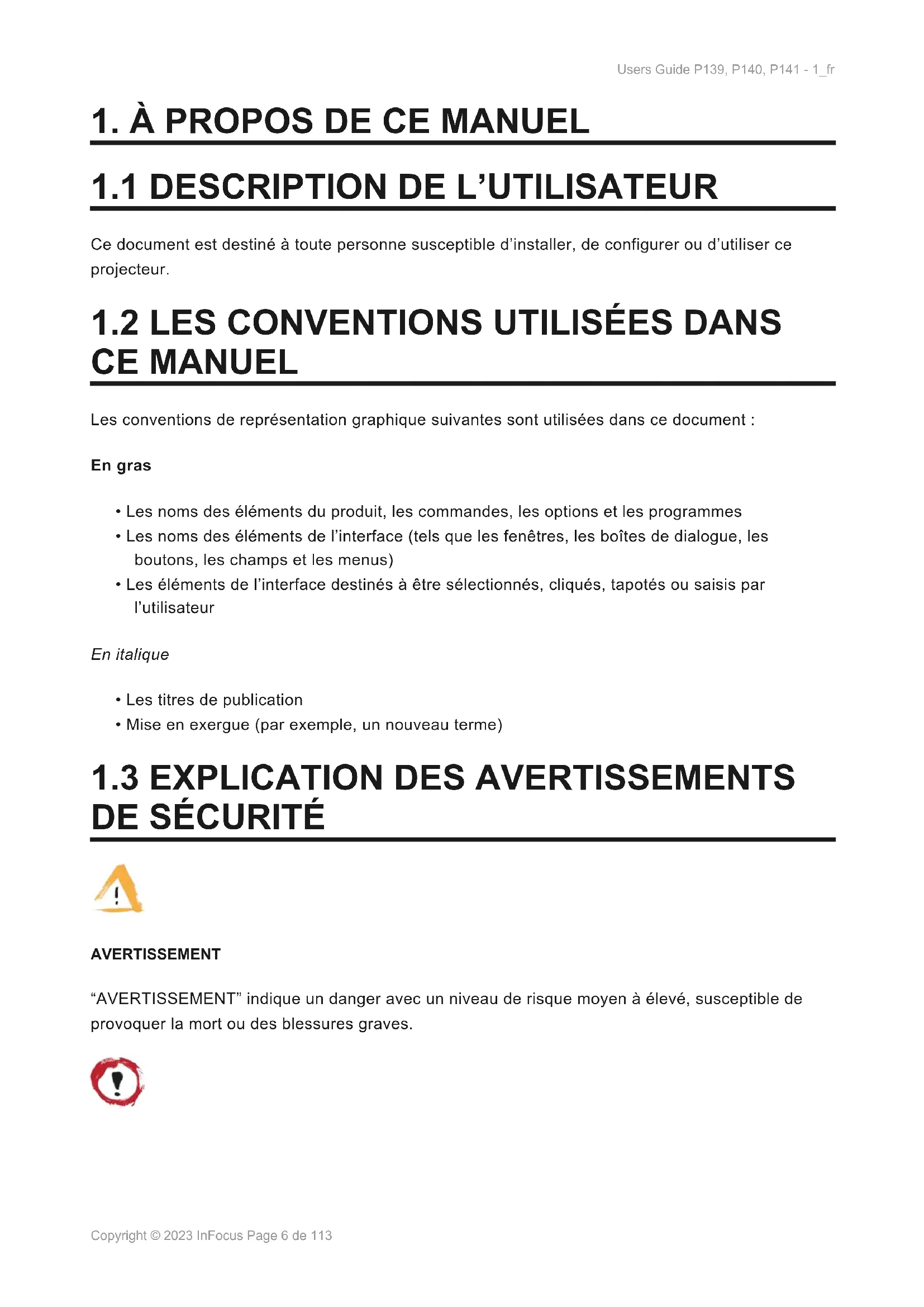 AVERTISSEMENT “AVERTISSEMENT” indique un danger avec un niveau de risque moyen à élevé, susceptible de provoquer la mort ou des blessures graves. Users Guide P139, P140, P141 - 1_fr Copyright © 2023 InFocus Page 6 de 113ATTENTION “ATTENTION” indique un danger à faible niveau de risque, qui, si on ne l’évite pas, pourrait provoquer des blessures mineures ou modérées. INFORMATION “INFORMATION” indique des informations considérées comme importantes, mais non liées à un danger.