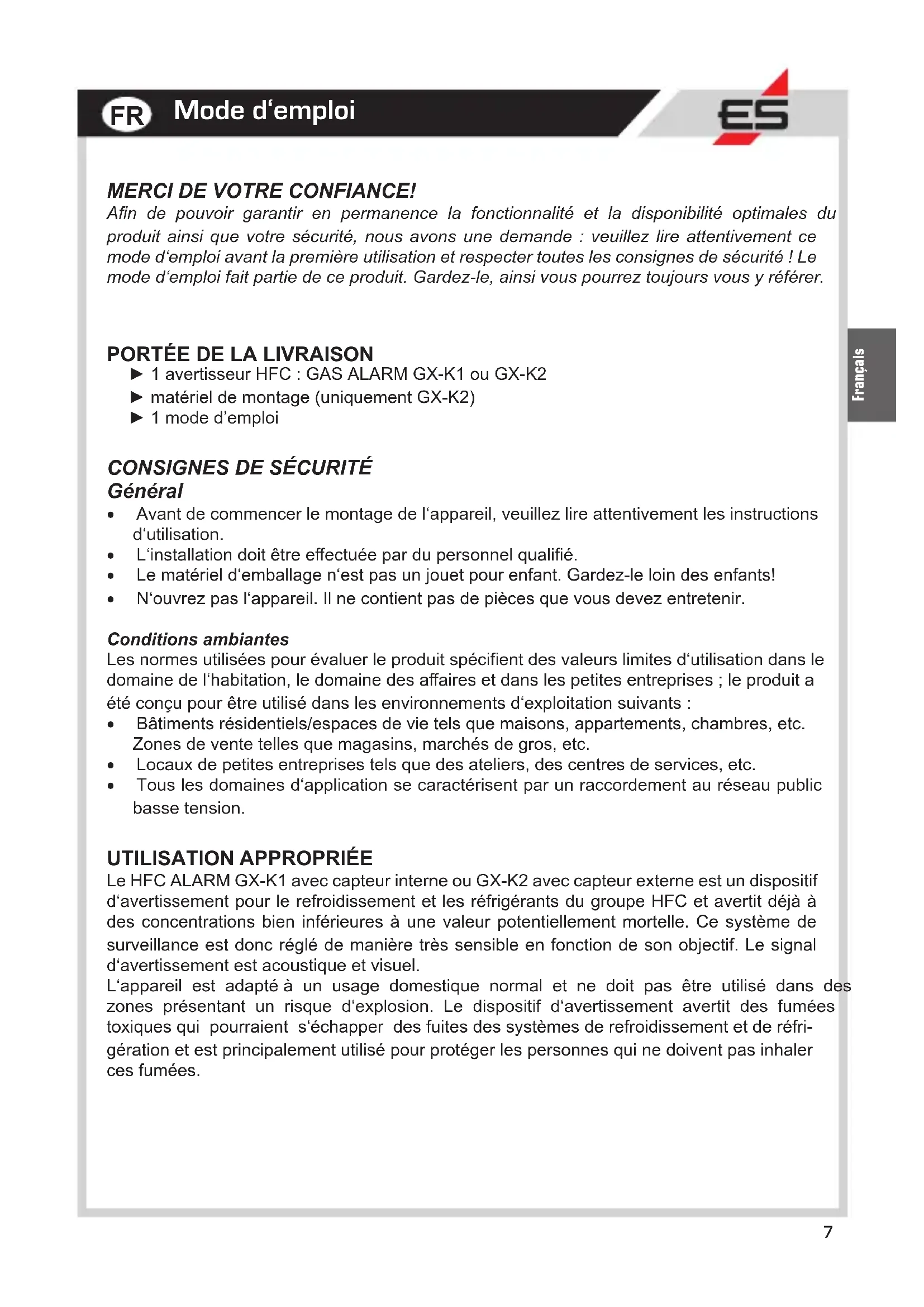 ► 1 avertisseur HFC : GAS ALARM GX-K1 ou GX-K2 ► matériel de montage (uniquement GX-K2) ► 1 mode d’emploi Mode d‘emploi