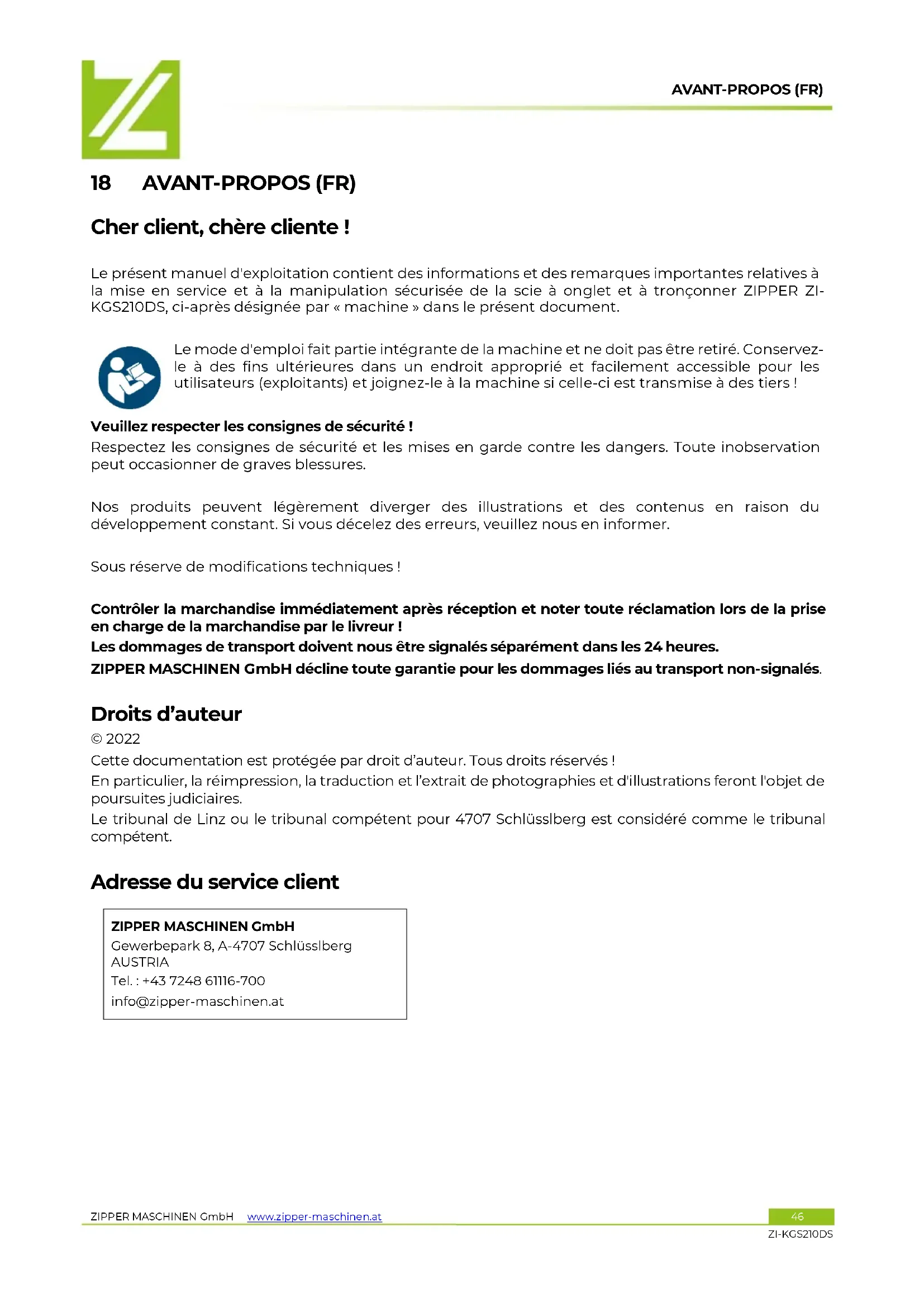 Adjust the angular positionAVANT-PROPOS (FR) ZIPPER MASCHINEN GmbH www.zipper-maschinen.at 46 ZI-KGS210DS 18 AVANT-PROPOS (FR) Cher client, chère cliente ! Le présent manuel d'exploitation contient des informations et des remarques importantes relatives à la mise en service et à la manipulation sécurisée de la scie à onglet et à tronçonner ZIPPER ZI- KGS210DS, ci-après désignée par « machine » dans le présent document. Le mode d'emploi fait partie intégrante de la machine et ne doit pas être retiré. Conservez- le à des fins ultérieures dans un endroit approprié et facilement accessible pour les utilisateurs (exploitants) et joignez-le à la machine si celle-ci est transmise à des tiers ! Veuillez respecter les consignes de sécurité ! Respectez les consignes de sécurité et les mises en garde contre les dangers. Toute inobservation peut occasionner de graves blessures. Nos produits peuvent légèrement diverger des illustrations et des contenus en raison du développement constant. Si vous décelez des erreurs, veuillez nous en informer. Sous réserve de modifications techniques ! Contrôler la marchandise immédiatement après réception et noter toute réclamation lors de la prise en charge de la marchandise par le livreur ! Les dommages de transport doivent nous être signalés séparément dans les 24 heures. ZIPPER MASCHINEN GmbH décline toute garantie pour les dommages liés au transport non-signalés. Droits d’auteur © 2022 Cette documentation est protégée par droit d’auteur. Tous droits réservés ! En particulier, la réimpression, la traduction et l’extrait de photographies et d'illustrations feront l'objet de poursuites judiciaires. Le tribunal de Linz ou le tribunal compétent pour 4707 Schlüsslberg est considéré comme le tribunal compétent. Adresse du service client