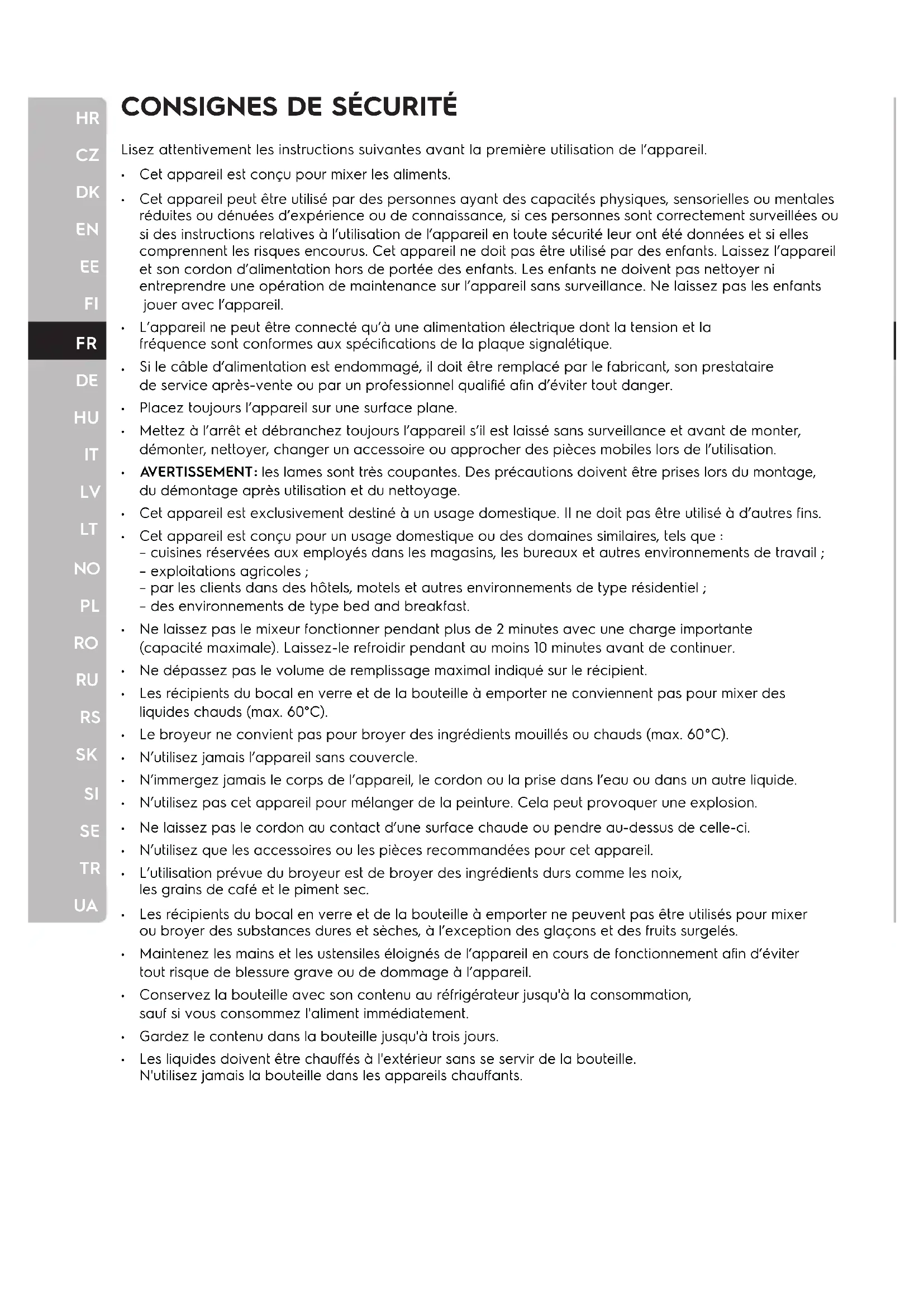 du démontage après utilisation et du nettoyage. Cet appareil est exclusivement destiné à un usage domestique. Il ne doit pas être utilisé à d’autres f ins. Cet appareil est conçu pour un usage domestique ou des domaines similaires, tels que : – cuisines réservées aux employés dans les magasins, les bureaux et autres environnements de travail ; – exploitations agricoles ; – par les clients dans des hôtels, motels et autres environnements de type résidentiel ; – des environnements de type bed and breakfast. Ne laissez pas le mixeur fonctionner pendant plus de 2 minutes avec une charge importante (capacité maximale). Laissez-le refroidir pendant au moins 10 minutes avant de continuer. Ne dépassez pas le volume de remplissage maximal indiqué sur le récipient. Les récipients du bocal en verre et de la bouteille à emporter ne conviennent pas pour mixer des liquides chauds (max. 60°C). Le broyeur ne convient pas pour broyer des ingrédients mouillés ou chauds (max. 60°C). N’utilisez jamais l’appareil sans couvercle. N’immergez jamais le corps de l’appareil, le cordon ou la prise dans l’eau ou dans un autre liquide. N’utilisez pas cet appareil pour mélanger de la peinture. Cela peut provoquer une explosion. Ne laissez pas le cordon au contact d’une surface chaude ou pendre au-dessus de celle-ci. N’utilisez que les accessoires ou les pièces recommandées pour cet appareil. L’utilisation prévue du broyeur est de broyer des ingrédients durs comme les noix, les grains de café et le piment sec. Les récipients du bocal en verre et de la bouteille à emporter ne peuvent pas être utilisés pour mixer ou broyer des substances dures et sèches, à l’exception des glaçons et des fruits surgelés. Maintenez les mains et les ustensiles éloignés de l’appareil en cours de fonctionnement af in d’éviter tout risque de blessure grave ou de dommage à l’appareil. Conservez la bouteille avec son contenu au réfrigérateur jusqu'à la consommation, sauf si vous consommez l'aliment immédiatement. Gardez le contenu dans la bouteille jusqu'à trois jours. Les liquides doivent être chauf fés à l'extérieur sans se servir de la bouteille. N'utilisez jamais la bouteille dans les appareils chauf fants.HR
