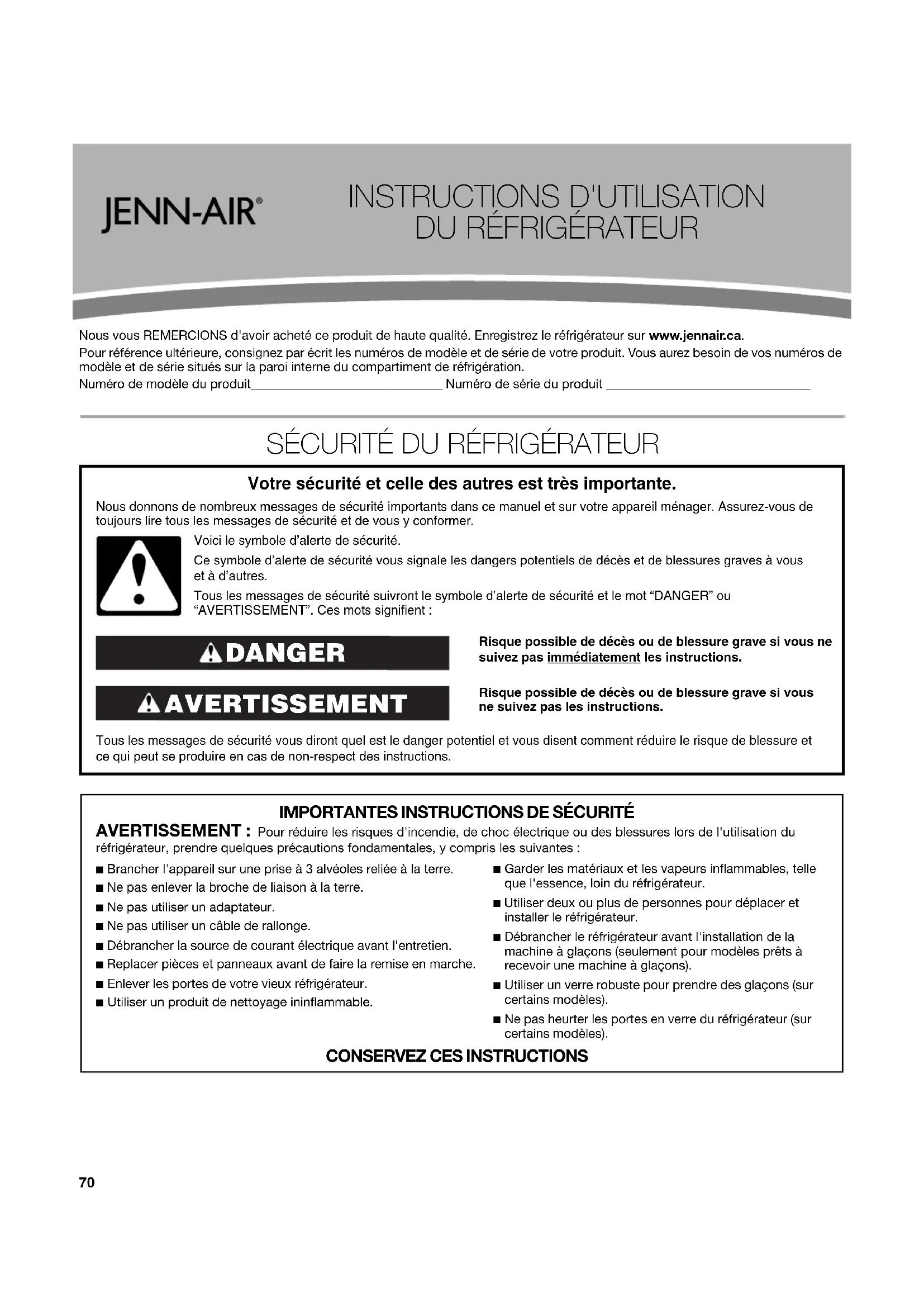 ■ Brancher l'appareil sur une prise à 3 alvéoles reliée à la terre. ■ Ne pas enlever la broche de liaison à la terre.■ Ne pas utiliser un adaptateur.■ Ne pas utiliser un câble de rallonge. ■ Débrancher la source de courant électrique avant l'entretien. ■ Replacer pièces et panneaux avant de faire la remise en marche.■ Enlever les portes de votre vieux réfrigérateur.■ Utiliser un produit de nettoyage ininflammable.■ Garder les matériaux et les vapeurs inflammables, telle que l'essence, loin du réfrigérateur.■ Utiliser deux ou plus de personnes pour déplacer et installer le réfrigérateur.■ Débrancher le réfrigérateur avant l'installation de la machine à glaçons (seulement pour modèles prêts à recevoir une machine à glaçons). ■ Utiliser un verre robuste pour prendre des glaçons (sur certains modèles). ■ Ne pas heurter les portes en verre du réfrigérateur (sur certains modèles).71 Mise au rebut adéquate de votre vieux réfrigérateur IMPORTANT : L’emprisonnement et l’étouffement des enfants ne sont pas un problème du passé. Les réfrigérateurs jetés ou abandonnés sont encore dangereux, même s’ils sont laissés abandonnés pendant “quelques jours seulement”. Si vous vous débarrassez de votre vieux réfrigérateur, veuillez suivre les instructions suivantes pour aider à éviter les accidents. Avant de jeter votre vieux réfrigérateur ou congélateur : ■ Enlever les portes. ■ Laisser les tablettes en place de sorte que les enfants ne puissent pas y pénétrer facilement.