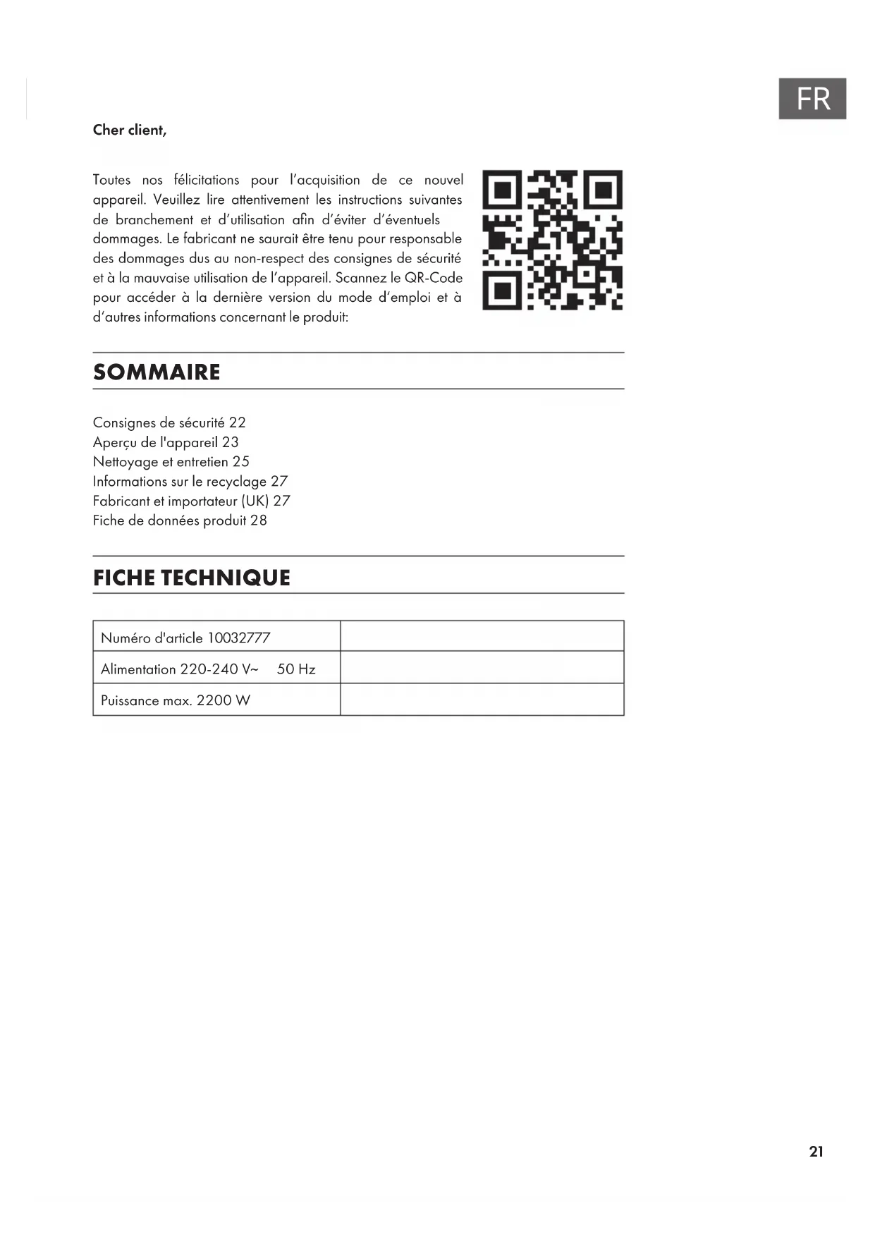 Cher client, Toutes nos félicitations pour l’acquisition de ce nouvel appareil. Veuillez lire attentivement les instructions suivantes de branchement et d’utilisation an d’éviter d’éventuels dommages. Le fabricant ne saurait être tenu pour responsable des dommages dus au non-respect des consignes de sécurité et à la mauvaise utilisation de l’appareil. Scannez le QR-Code pour accéder à la dernière version du mode d‘emploi et à d‘autres informations concernant le produit: SOMMAIRE Consignes de sécurité 22 Aperçu de l'appareil 23 Nettoyage et entretien 25 Informations sur le recyclage 27 Fabricant et importateur (UK) 27 Fiche de données produit 28 FICHE TECHNIQUE Numéro d'article 10032777 Alimentation 220-240 V~ 50 Hz Puissance max. 2200 W22