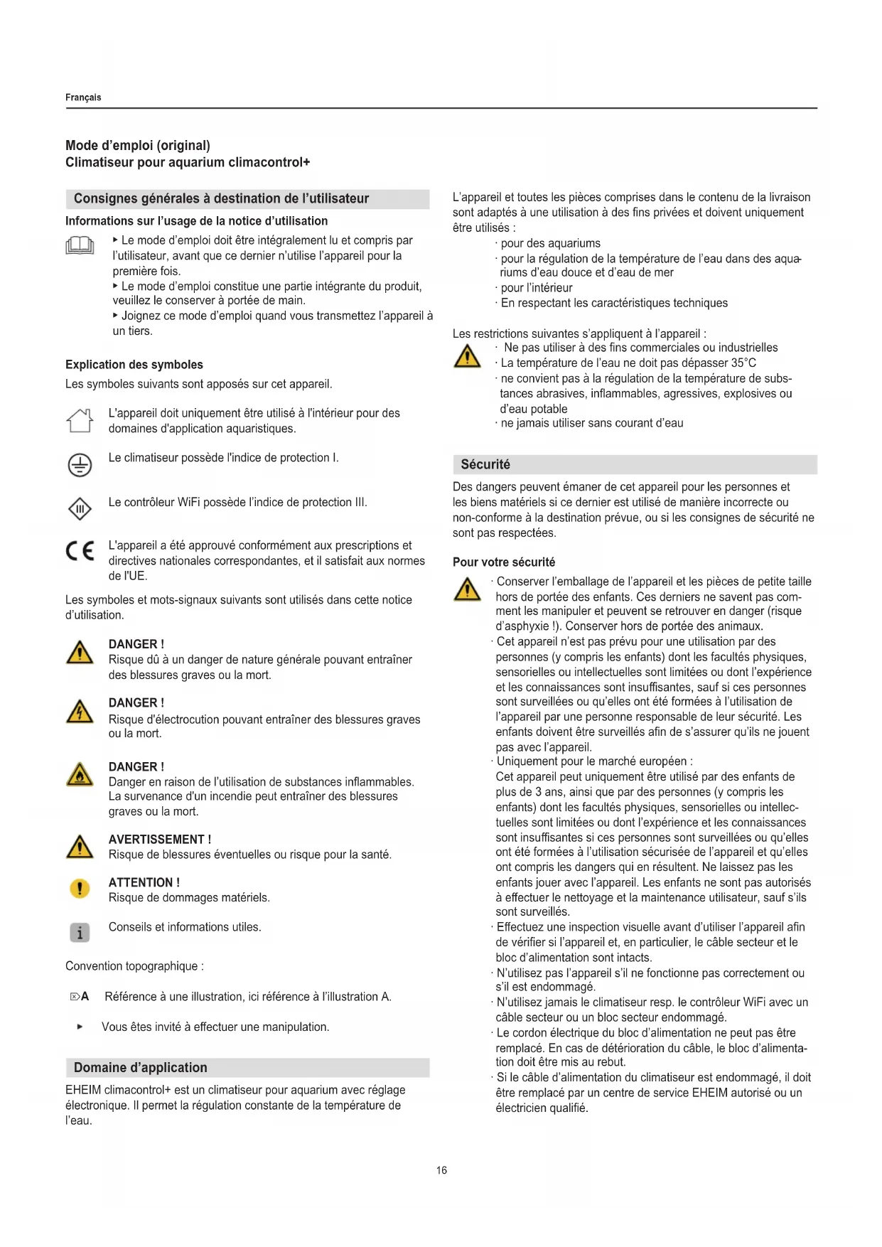 = 0.1 W/l ** = value calculation 1× Aquarium with cover, room temperature 20°C, Δt = temperature dierence: room temperature to water temperature Spare parts See page 3.16 Français Mode d’emploi (original) Climatiseur pour aquarium climacontrol+ Consignes générales à destination de l’utilisateur Informations sur l’usage de la notice d’utilisation ▶ Le mode d’emploi doit être intégralement lu et compris par l’utilisateur, avant que ce dernier n’utilise l’appareil pour la première fois. ▶ Le mode d’emploi constitue une partie intégrante du produit, veuillez le conserver à portée de main. ▶ Joignez ce mode d’emploi quand vous transmettez l’appareil à un tiers. Explication des symboles Les symboles suivants sont apposés sur cet appareil. L'appareil doit uniquement être utilisé à l'intérieur pour des domaines d'application aquaristiques. Le climatiseur possède l'indice de protection I. Le contrôleur WiFi possède l’indice de protection III. L'appareil a été approuvé conformément aux prescriptions et directives nationales correspondantes, et il satisfait aux normes de l'UE. Les symboles et mots-signaux suivants sont utilisés dans cette notice d’utilisation. DANGER ! Risque dû à un danger de nature générale pouvant entraîner des blessures graves ou la mort. DANGER ! Risque d'électrocution pouvant entraîner des blessures graves ou la mort. DANGER ! Danger en raison de l’utilisation de substances inammables. La survenance d'un incendie peut entraîner des blessures graves ou la mort. AVERTISSEMENT ! Risque de blessures éventuelles ou risque pour la santé. ATTENTION ! Risque de dommages matériels. Conseils et informations utiles. Convention topographique : Référence à une illustration, ici référence à l’illustration A. Vous êtes invité à eectuer une manipulation.