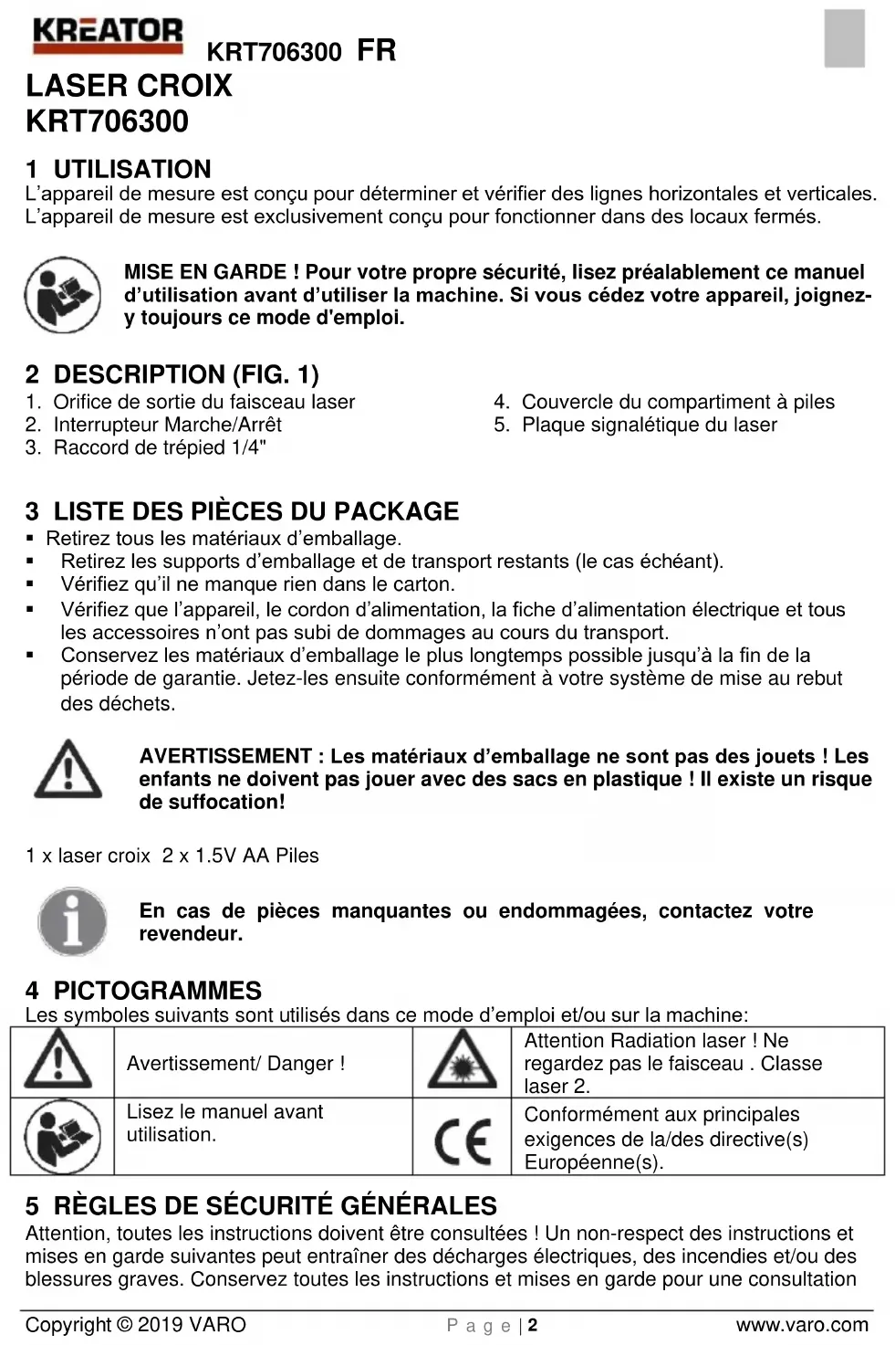 Copyright © 2019 VARO P a g e | 2 www.varo.com LASER CROIX KRT706300 1 UTILISATION L’appareil de mesure est conçu pour déterminer et vérifier des lignes horizontales et verticales. L’appareil de mesure est exclusivement conçu pour fonctionner dans des locaux fermés. MISE EN GARDE ! Pour votre propre sécurité, lisez préalablement ce manuel d’utilisation avant d’utiliser la machine. Si vous cédez votre appareil, joignez- y toujours ce mode d'emploi. 2 DESCRIPTION (FIG. 1)