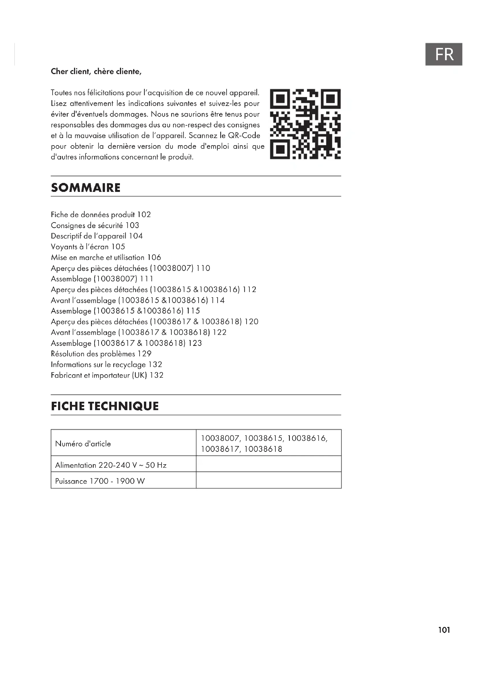 Cher client, chère cliente, Toutes nos félicitations pour l’acquisition de ce nouvel appareil. Lisez attentivement les indications suivantes et suivez-les pour éviter d'éventuels dommages. Nous ne saurions être tenus pour responsables des dommages dus au non-respect des consignes et à la mauvaise utilisation de l’appareil. Scannez le QR-Code pour obtenir la dernière version du mode d'emploi ainsi que d'autres informations concernant le produit. SOMMAIRE Fiche de données produit102 Consignes de sécurité103 Descriptif de l‘appareil104 Voyants à l‘écran105 Mise en marche et utilisation106 Aperçu des pièces détachées (10038007)110 Assemblage (10038007)111 Aperçu des pièces détachées (10038615 &10038616)112 Avant l‘assemblage (10038615 &10038616)114 Assemblage (10038615 &10038616)115 Aperçu des pièces détachées (10038617 & 10038618)120 Avant l‘assemblage (10038617 & 10038618)122 Assemblage (10038617 & 10038618)123 Résolution des problèmes129 Informations sur le recyclage132 Fabricant et importateur (UK)132 FICHE TECHNIQUE Numéro d'article 10038007, 10038615, 10038616, 10038617, 10038618 Alimentation 220-240 V ~ 50 Hz Puissance 1700 - 1900 W102
