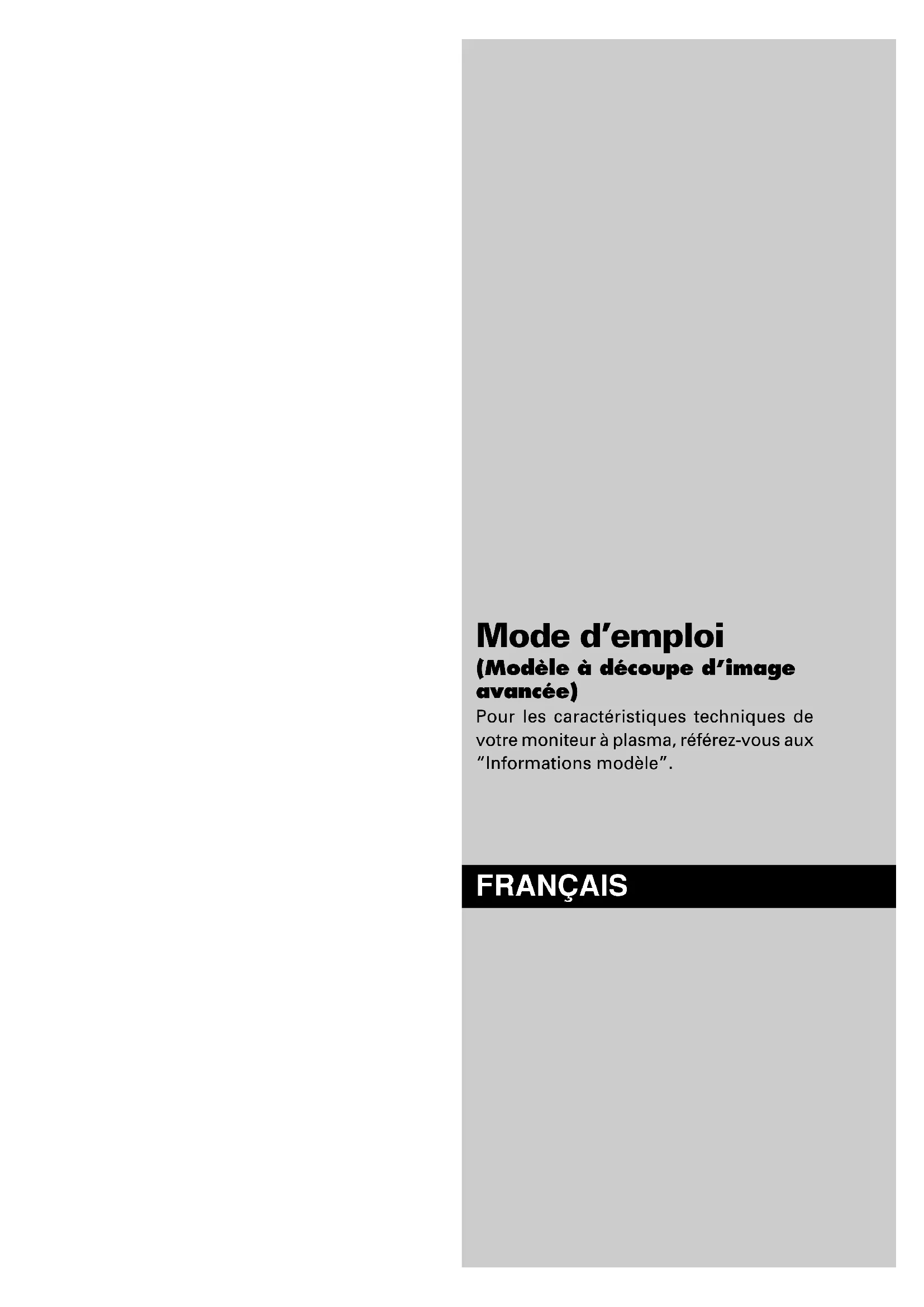 Limited Warranty Plasma MonitorsEn-36Mode d’emploi (Modèle à découpe d’image avancée) Pour les caractéristiques techniques de votre moniteur à plasma, référez-vous aux “Informations modèle”. FRANÇAISFr-2