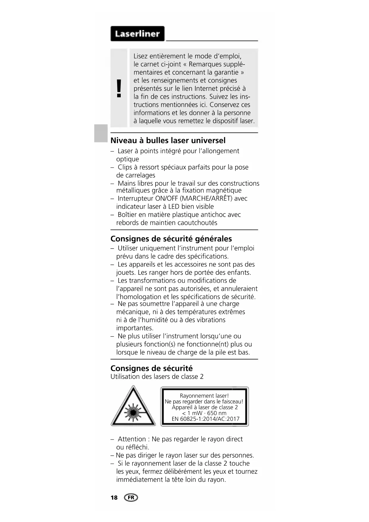 Rayonnement laser! Ne pas regarder dans le faisceau! Appareil à laser de classe 2 < 1 mW · 650 nm EN 60825-1:2014/AC:2017 Consignes de sécurité Utilisation des lasers de classe 2 Consignes de sécurité générales – Utiliser uniquement l‘instrument pour l‘emploi prévu dans le cadre des spécications. – Les appareils et les accessoires ne sont pas des jouets. Les ranger hors de portée des enfants. – Les transformations ou modications de l’appareil ne sont pas autorisées, et annuleraient l’homologation et les spécications de sécurité. – Ne pas soumettre l’appareil à une charge mécanique, ni à des températures extrêmes ni à de l’humidité ou à des vibrations importantes. – Ne plus utiliser l‘instrument lorsqu‘une ou plusieurs fonction(s) ne fonctionne(nt) plus ou lorsque le niveau de charge de la pile est bas. Lisez entièrement le mode d‘emploi, le carnet ci-joint «Remarques supplé- mentaires et concernant la garantie» et les renseignements et consignes présentés sur le lien Internet précisé à la fin de ces instructions. Suivez les ins- tructions mentionnées ici. Conservez ces informations et les donner à la personne à laquelle vous remettez le dispositif laser. !HandyLaser