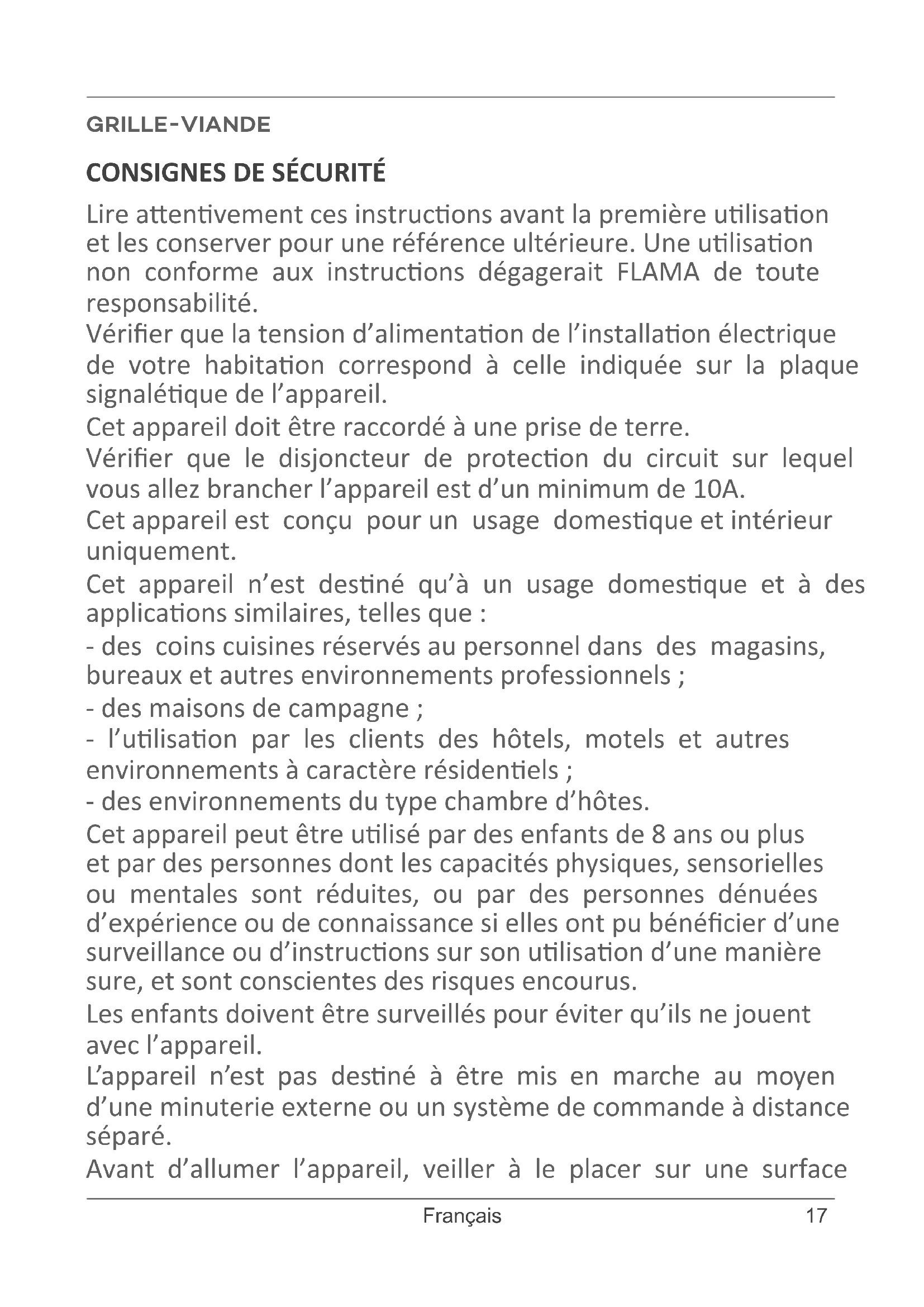 Lire aenvement ces instrucons avant la première ulisaon et les conserver pour une référence ultérieure. Une ulisaon non conforme aux instrucons dégagerait FLAMA de toute responsabilité. Vérier que la tension d’alimentaon de l’installaon électrique de votre habitaon correspond à celle indiquée sur la plaque signaléque de l’appareil. Cet appareil doit être raccordé à une prise de terre. Vérier que le disjoncteur de protecon du circuit sur lequel vous allez brancher l’appareil est d’un minimum de 10A. Cet appareil est conçu pour un usage domesque et intérieur uniquement. Cet appareil n’est desné qu’à un usage domesque et à des applicaons similaires, telles que : - des coins cuisines réservés au personnel dans des magasins, bureaux et autres environnements professionnels ; - des maisons de campagne ; - l’ulisaon par les clients des hôtels, motels et autres environnements à caractère résidenels ; - des environnements du type chambre d’hôtes. Cet appareil peut être ulisé par des enfants de 8 ans ou plus et par des personnes dont les capacités physiques, sensorielles ou mentales sont réduites, ou par des personnes dénuées d’expérience ou de connaissance si elles ont pu bénécier d’une surveillance ou d’instrucons sur son ulisaon d’une manière sure, et sont conscientes des risques encourus. Les enfants doivent être surveillés pour éviter qu’ils ne jouent avec l’appareil. L’appareil n’est pas desné à être mis en marche au moyen d’une minuterie externe ou un système de commande à distance séparé. Avant d’allumer l’appareil, veiller à le placer sur une surface18 www.ama.pt plane, stable et horizontale. Le neoyage et l’entreen de l’appareil ne doivent pas être eectués par des enfants, sauf s’ils ont plus de 8 ans et s’ils sont surveillés. Tenir l’appareil et son câble d’alimentaon hors de portée des enfants de moins de 8 ans lorsqu’il est allumé ou en cours de refroidissement. Averssement - Les températures des surfaces accessibles peuvent être élevées durant le fonconnement de l’appareil. Débrancher l’appareil de l’alimentaon électrique en rerant la che de la prise de courant après chaque ulisaon et lors du neoyage. Le laisser refroidir avant de le neoyer ou de le ranger. Ne pas uliser l’appareil s’il ne fonconne pas correctement ou s’il est endommagé de quelque façon que ce soit. Toute opéraon autre que le neoyage doit être eectuée par un service d’assistance technique agréé FLAMA. Si le câble d’alimentaon est endommagé, il doit être remplacé par le fabricant, son service après-vente ou un personnel qualié similaire an d’éviter tout danger. L’appareil ne doit jamais être ulisé à proximité de matériaux inammables ou combusbles. Ne jamais laisser l’appareil sans surveillance. Ne pas couvrir l’appareil lorsqu’il fonconne. Ne pas démonter l’appareil. L’appareil ne doit être ulisé que pour cuisiner les aliments. L’ulisaon à d’autres ns peut causer des dommages irréparables. Ne jamais immerger l’appareil dans l’eau ou tout autre liquide.