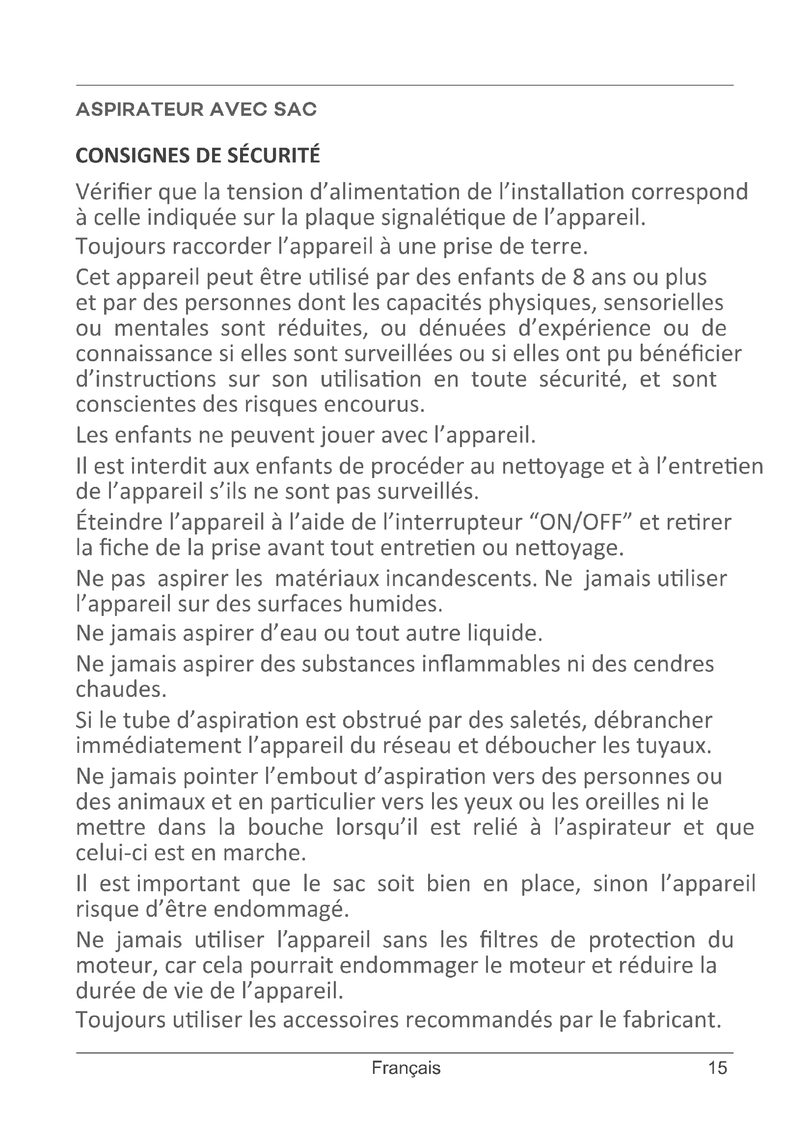 Débrancher le câble d’alimentaon de la prise avant toute opéraon d’entreen ou de remplacement des pièces. Éteindre l’aspirateur après son ulisaon en appuyant sur le bouton ON/OFF et débrancher le câble d’alimentaon de la prise. Tout d’abord, neoyer les pares externes de l’aspirateur avec un chion doux et humide, puis avec un chion doux et sec. Ne jamais uliser de liquides agressifs pour neoyer l’aspirateur. Remplacement du sac à poussière Lorsque l’indicateur de remplissage du sac s’acve, vérier et, si nécessaire, remplacer le sac à poussière. Appuyer sur le levier de déblocage et soulever le couvercle du sac à poussière. Rerer le sac à poussière. Jeter ou vider le contenu, en cas de sac réulisable. Le sac réulisable doit être éliminé de manière consciente et avec soin. Remplacer par un nouveau sac. Fermer le couvercle du sac à poussière. Note : L’indicateur de remplissage du sac peut aussi clignoter en cas d’obstrucon. Dans ce cas, vérier la cause de l’obstrucon. FILTRES Le ltre de protecon du moteur (situé près du sac) doit être reré et neoyé à l’eau deux fois par an ou lorsque celui- ci est visiblement obstrué. Si le ltre est endommagé, remplacer par un nouveau ltre. En cas d’usure, neoyer le ltre en temps ule. Pour cela, déboîter la grille et secouer le ltre pour éliminer la saleté accumulée. Ensuite, remere le ltre en place et emboîter la grille. Pour garanr le bon fonconnement de l’aspirateur, laver le ltre de protecon du moteur et le ltre de sore d’air (HEPA) après avoir remplacé le sac 5 fois. Laver les ltres à la main avec de l’eau ède et laisser sécher complètement avant de les remere dans l’aspirateur. Note : Ne pas uliser d’eau chaude ni de détergents. Remplacer les ltres endommagés. Ne pas essayer d’uliser l’aspirateur lorsque le sac et les ltres respecfs ne sont pas en place.19 Français DYSFONCTIONNEMENTS ET RÉPARATIONS En cas de panne, coner l’appareil à un service d’assistance technique agréé. Ne pas démonter ou réparer l’appareil, car cela pourrait présenter un danger. PROTECTION DE L’ENVIRONNEMENT Ce symbole indique la collecte séparée d’équipements électriques et électroniques L’objecf principal de la collecte séparée de ces résidus est de réduire la quanté à éliminer, de promouvoir la réulisaon, le recyclage et d’autres formes de valorisaon en vue de diminuer leurs eets négafs sur l’environnement. Lorsque cet appareil est mis au rebut, il ne doit pas être jeté avec les autres résidus urbains de manière non diérenciée. L’ulisateur est responsable de déposer lui- même gratuitement les déchets dans les installaons de collecte sélecve prévues à cet eet. La reprise des équipements au rebut peut également s’eectuer auprès des points de vente lors de l’achat d’un nouvel appareil équivalent ou doté de foncons similaires. Pour obtenir des informaons plus détaillées sur les locaux de collecte, veuillez-vous renseigner auprès de la mairie ou auprès du point de vente dans lequel vous vous êtes procuré ces équipements.Esta página foi deliberadamente deixada em branco Esta página se ha dejado en blanco deliberadamente This page has been deliberately le blank Cee page a été volontairement laissée viergeEsta página foi deliberadamente deixada em branco Esta página se ha dejado en blanco deliberadamente This page has been deliberately le blank Cee page a été volontairement laissée viergeCONDIÇÕES DE GARANTIA