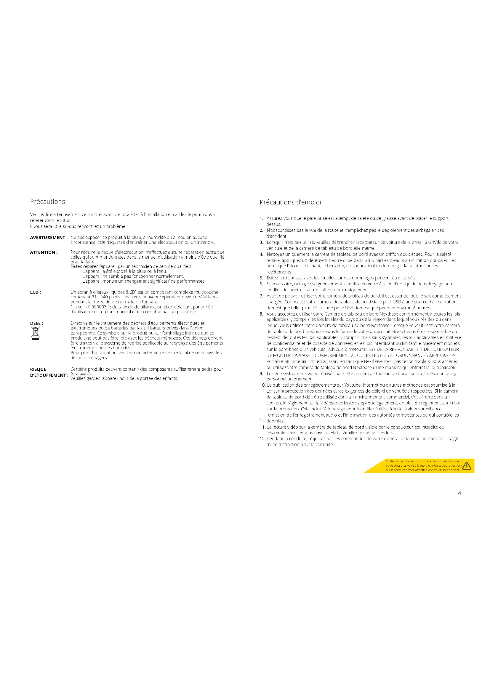 d'une distraction pour la conduite.55 Avertissements concernant le produit Ne pas tenir compte des avertissements suivants pourrait provoquer un accident ou une collision pouvant conduire à la mort ou à des blessures graves. Avertissement concernant la distraction Cette DashCam vise à améliorer la connaissance de la situation lorsqu’elle est utilisée correctement. En cas d’utilisation inappropriée, l’affichage pourrait vous distraire, ce qui pourrait entraîner un accident causant des blessures graves voire la mort. NE CHERCHEZ PAS à accéder aux informations stockées sur la DashCam ou à modifier les paramètres de l’appareil alors que vous conduisez. Les informations stockées sur la DashCam doivent être visionnées seulement lorsque le véhicule est immobilisé et stationné dans un endroit sûr, conformément aux lois locales. Les paramètres de la DashCam ne doivent être modifiés que lorsque le véhicule est immobilisé et stationné dans un endroit sûr, conformément aux lois locales. Tenez toujours compte de ce qui vous entoure et ne regardez pas l’écran, ni ne vous laissez distraire. En regardant l’écran, vous risquez de rater des obstacles ou des dangers. Utilisez la DashCam à vos risques et périls. Ne modifiez pas des paramètres ni n’accédez à aucune fonction exigeant une manipulation prolongée des commandes de la DashCam lors de la conduite. Arrêtez-vous dans un endroit sûr et conformément au code de la route avant d’effectuer de telles opérations. La lecture de la vidéo sur des appareils dotés d’écran par le conducteur est interdite ou restreinte dans certains pays ou états. Veuillez respecter ces lois. Avertissements concernant l’installation dans le véhicule Quand vous installez la DashCam dans un véhicule, ne la placez pas là où elle gênerait la visibilité du conducteur sur la route, ni là où elle entraverait l’utilisation des commandes du véhicule, telles que volant, pédales ou leviers de vitesse. Ne la laissez pas sur le tableau de bord du véhicule sans la fixer. Ne placez pas la DashCam devant ou sur un coussin de sécurité gonflable. Avertissements concernant les batteries Des batteries lithium-ion sont utilisées dans la plupart des caméras embarquées Nextbase™. Le non-respect des instructions ci-dessous pourrait diminuer la durée de vie des batteries et présenter un risque de dommages à la DashCam, un risque d’incendie, de brûlures chimiques, de fuite d’électrolyte ou de blessures. - Ne pas démonter, modifier, adapter, percer ou endommager la DashCam ou les batteries. - Ne pas démonter, ni n’essayer de retirer une batterie non remplaçable par l’utilisateur. - Ne pas exposer la DashCam à un incendie, à une explosion ou à d’autres dangers. - Ne pas exposer la DashCam à la pluie ou à l’eau. Avertissements concernant les pièces magnétiques La DashCam et ses supports peuvent contenir des aimants. Dans certaines circonstances, les aimants peuvent provoquer des interférences avec des dispositifs médicaux internes, comme les stimulateurs cardiaques et les pompes à insuline. Éloignez ces dispositifs médicaux des appareils et des supports qui contiennent des aimants. Les aimants peuvent entraîner des dommages à des appareils électroniques, notamment les disques durs équipant des ordinateurs portables et les cartes bancaires, de crédit ou de membre. Faites attention lorsque les appareils et les supports qui contiennent des aimants sont proches de dispositifs électroniques ou de cartes bancaires, de crédit ou de membre.6 Précautions d’emploi Le non-respect des avis suivants peut provoquer des blessures personnelles ou des dommages matériels, ou encore nuire aux fonctionnalités de la DashCam. Précautions concernant la batterie - N’exposez pas la DashCam ou les batteries à la pluie, à l’eau ou à d’autres liquides, ni ne la plongez. - Ne laissez pas la DashCam exposée à une source de chaleur ou dans un endroit soumis à une température élevée, notamment en plein soleil ou dans un véhicule sans surveillance. Pour prévenir tout risque de dommages, retirez la DashCam du véhicule ou rangez-la à l’abri de la lumière directe du soleil, comme dans la boîte à gants. - N’utilisez pas la DashCam hors de la plage de températures suivante: de -20 à 45°C (de -4 à 113°F). - Lorsque vous rangez la DashCam pour une longue période de temps, veillez à ce qu’elle se maintienne dans la plage de températures suivante: de 0 à 25°C (de 32 à 77°F). - N’utilisez pas un câble d’alimentation ou de données qui n’a pas été approuvé ou fourni par Nextbase™. - Contactez votre département local de gestion de déchets pour éliminer la DashCam ou les batteries, conformément aux lois et aux règlements locaux en vigueur. - Température minimale / maximale: -10 - > 50 degrés Celsius Précaution concernant les restrictions légales de montage sur le pare-brise Avant d’installer la DashCam sur votre pare-brise, vérifiez les lois et les ordonnances des autorités locales et nationales du pays où vous conduisez. Certaines lois interdisent ou limitent la mise en place d’objets sur le pare-brise du véhicule automobile. IL EST DE LA RESPONSABILITÉ DE L’UTILISATEUR D’INSTALLER L’APPAREIL DANS LE RESPECT DE TOUTES LES LOIS ET ORDONNANCES EN VIGUEUR. Montez toujours votre DashCam Nextbase™ à un emplacement où la visibilité du conducteur sur la route ne sera pas gênée. Nextbase™ n’accepte aucune responsabilité pour des sanctions, des peines ou des dommages résultant de la violation de lois ou d’ordonnances locales ou nationales découlant de l’utilisation de votre DashCam Nextbase™. Précautions concernant les obligations légales en matière de caméras Certaines juridictions considèrent une violation de la vie privée le fait de prendre ou d’afficher publiquement des photographies ou des vidéos reprenant des personnes ou leur