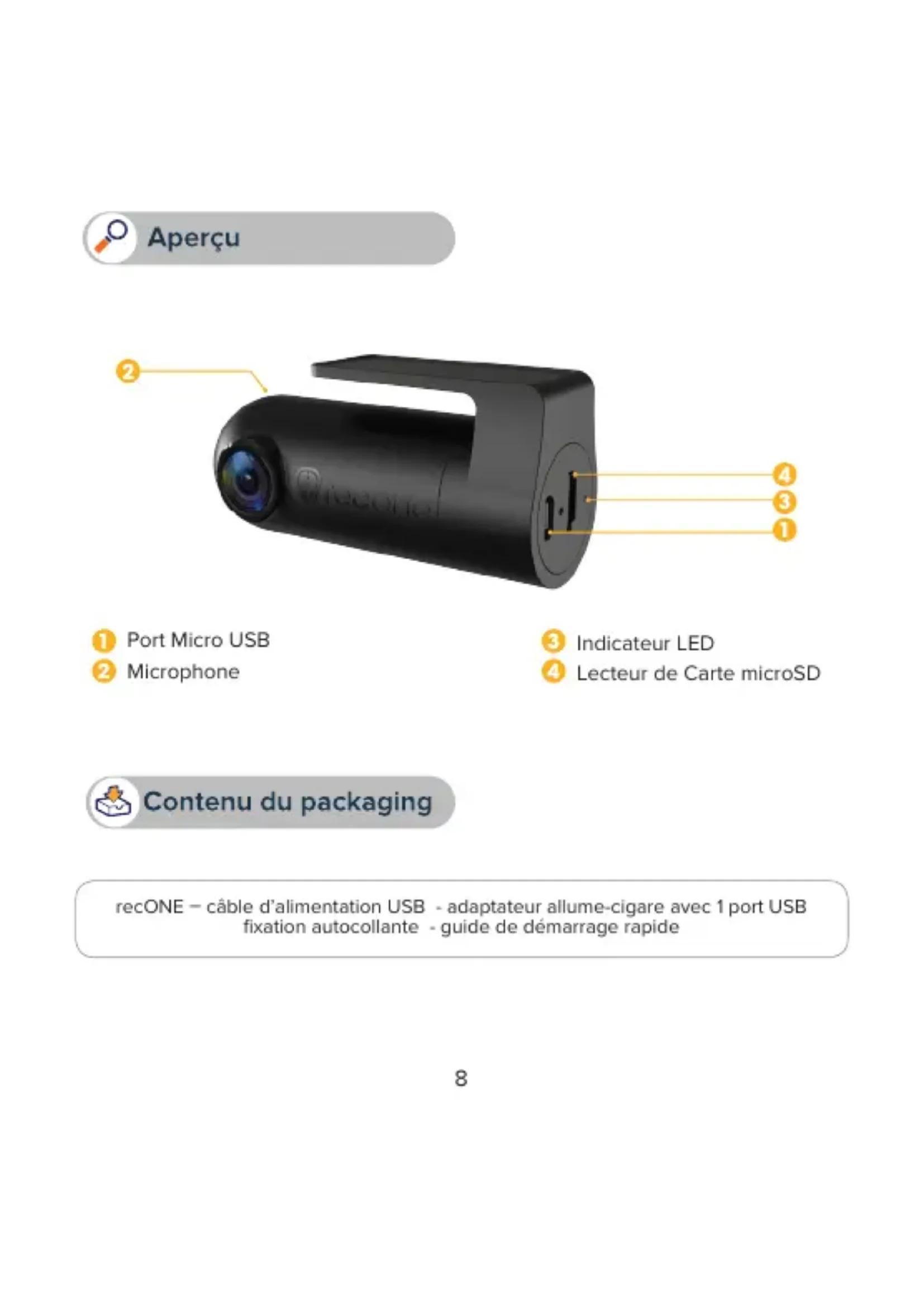 - recONE nécessite l’utilisation d’une carte microSD pour enregistrer des videos et prendre des photos (carte microSD non incluse)
