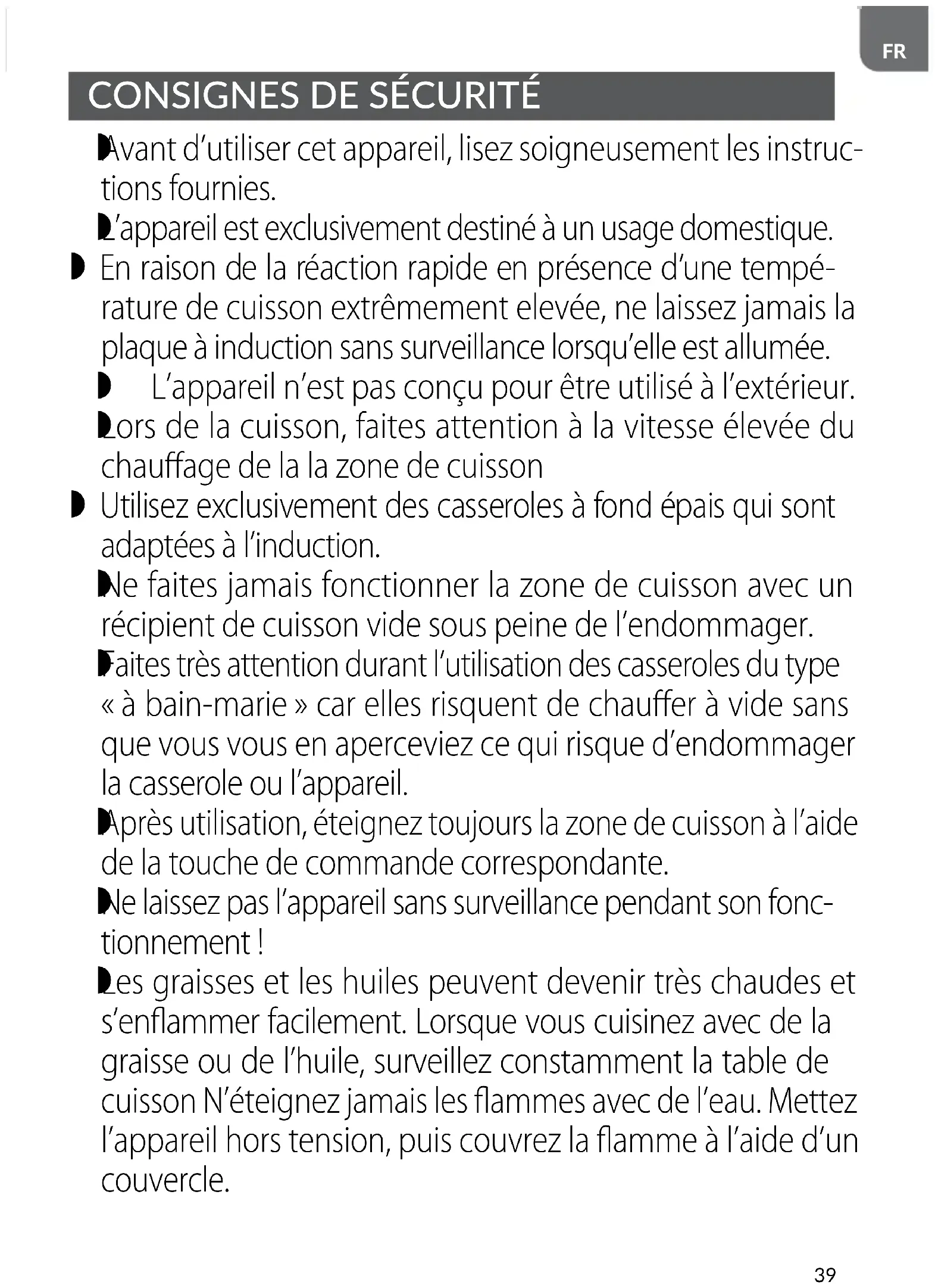 L'appareil n'est pas conçu pour être utilisé à l'extérieur. Lors de la cuisson, faites attention à la vitesse élevée du chauffage de la zone de cuisson.