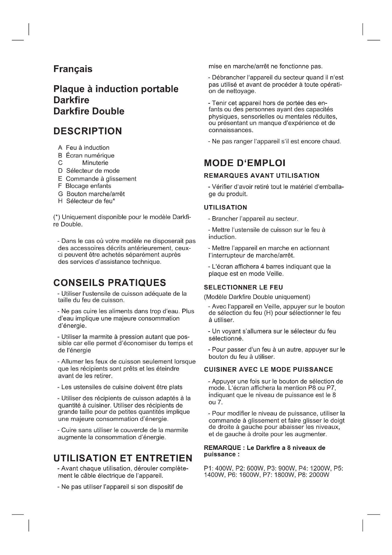 APPLIANCE - Stop the appliance using the on/o switch. - Unplug the appliance from the mains. - Clean the appliance. ERROR CODES The screen can show dierent Error codes. E0 → The accessory you are using is not detected. E1 → Don’t reach minimum voltage E2 → Too much Voltage for the plate. E3 → Thermostat open E4 → Thermostat broke E5 → PCB Thermostat open E6 → PCB Thermostat Broken E7 → Interior temperature detection system broke. E8 → Internal error not determined. E9 → Overheating. For E0, check if the accessory for cooking is induction compatible. Fore E1 – E9, take the appliance to the closest Technical assistance Service. CLEANING - Disconnect the appliance from the mains and allow it to cool before undertaking any cleaning task. - Clean the equipment with a damp cloth with a few drops of washing-up liquid and then dry. - Do not use solvents, or products with an acid or base pH such as bleach, or abrasive products, for cleaning the appliance. - Never submerge the appliance in water or any other liquid or place it under running water. - It is advisable to clean the appliance regularly and remove any food remains.SPECIAL MESSAGESFrançais Plaque à induction portable Darkre Darkre Double DESCRIPTION A Feu à induction B Écran numérique C Minuterie D Sélecteur de mode E Commande à glissement F Blocage enfants G Bouton marche/arrêt H Sélecteur de feu* (*) Uniquement disponible pour le modèle Dark- re Double. - Dans le cas où votre modèle ne disposerait pas des accessoires décrits antérieurement, ceux- ci peuvent être achetés séparément auprès des services d’assistance technique. CONSEILS PRATIQUES - Utiliser l‘ustensile de cuisson adéquate de la taille du feu de cuisson. - Ne pas cuire les aliments dans trop d‘eau. Plus d’eau implique une majeure consommation d’énergie. - Utiliser la marmite à pression autant que pos- sible car elle permet d’économiser du temps et de l‘énergie - Allumer les feux de cuisson seulement lorsque que les récipients sont prêts et les éteindre avant de les retirer. - Les ustensiles de cuisine doivent être plats - Utiliser des récipients de cuisson adaptés à la quantité à cuisiner. Utiliser des récipients de grande taille pour de petites quantités implique une majeure consommation d’énergie. - Cuire sans utiliser le couvercle de la marmite augmente la consommation d’énergie.