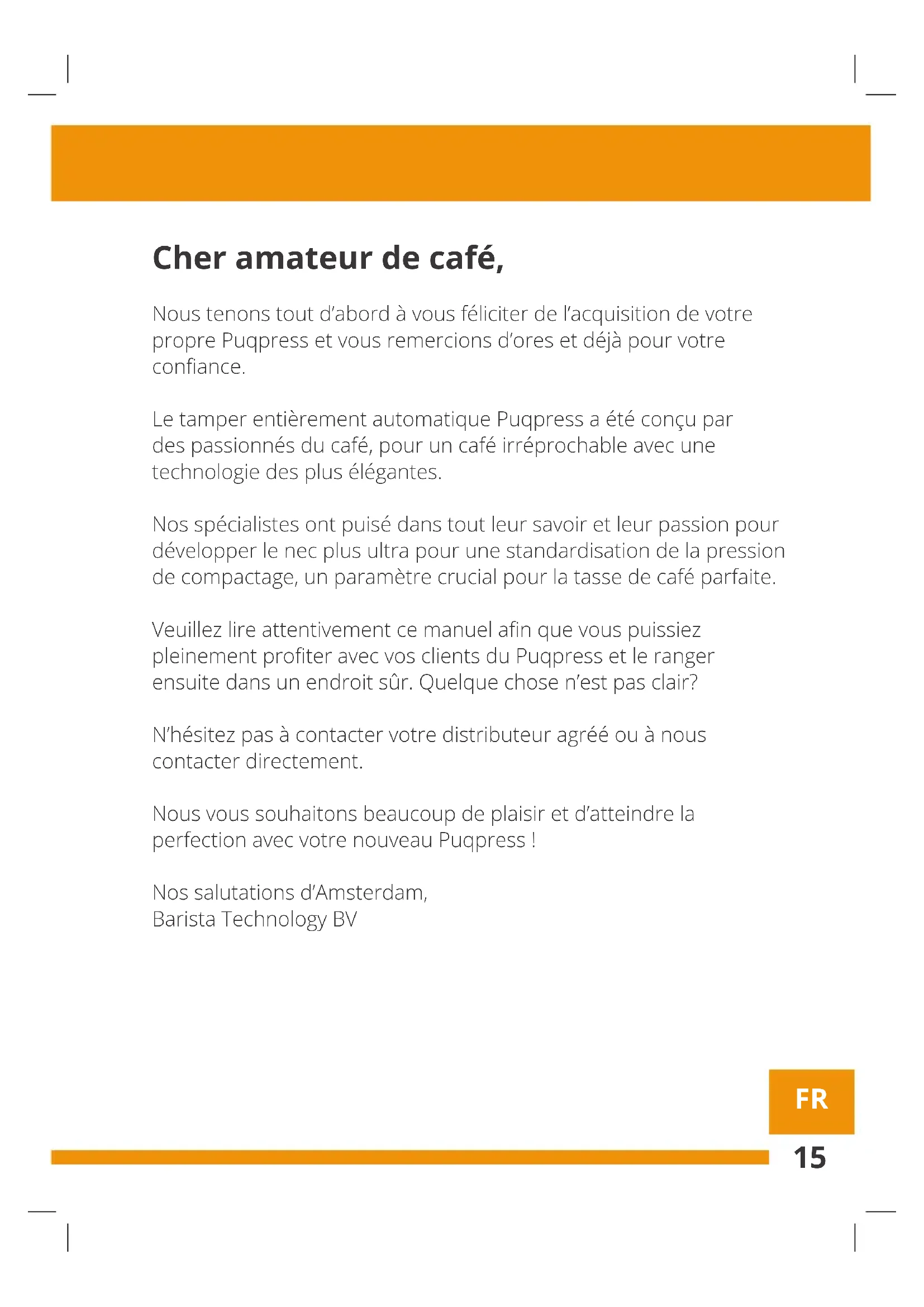 Cher amateur de café, Nous tenons tout d’abord à vous féliciter de l’acquisition de votre propre Puqpress et vous remercions d’ores et déjà pour votre conance. Le tamper entièrement automatique Puqpress a été conçu par des passionnés du café, pour un café irréprochable avec une technologie des plus élégantes. Nos spécialistes ont puisé dans tout leur savoir et leur passion pour développer le nec plus ultra pour une standardisation de la pression de compactage, un paramètre crucial pour la tasse de café parfaite. Veuillez lire attentivement ce manuel an que vous puissiez pleinement proter avec vos clients du Puqpress et le ranger ensuite dans un endroit sûr. Quelque chose n’est pas clair? N’hésitez pas à contacter votre distributeur agréé ou à nous contacter directement. Nous vous souhaitons beaucoup de plaisir et d’atteindre la perfection avec votre nouveau Puqpress ! Nos salutations d’Amsterdam, Barista Technology BV16 Table of content 1 Sécurité 19