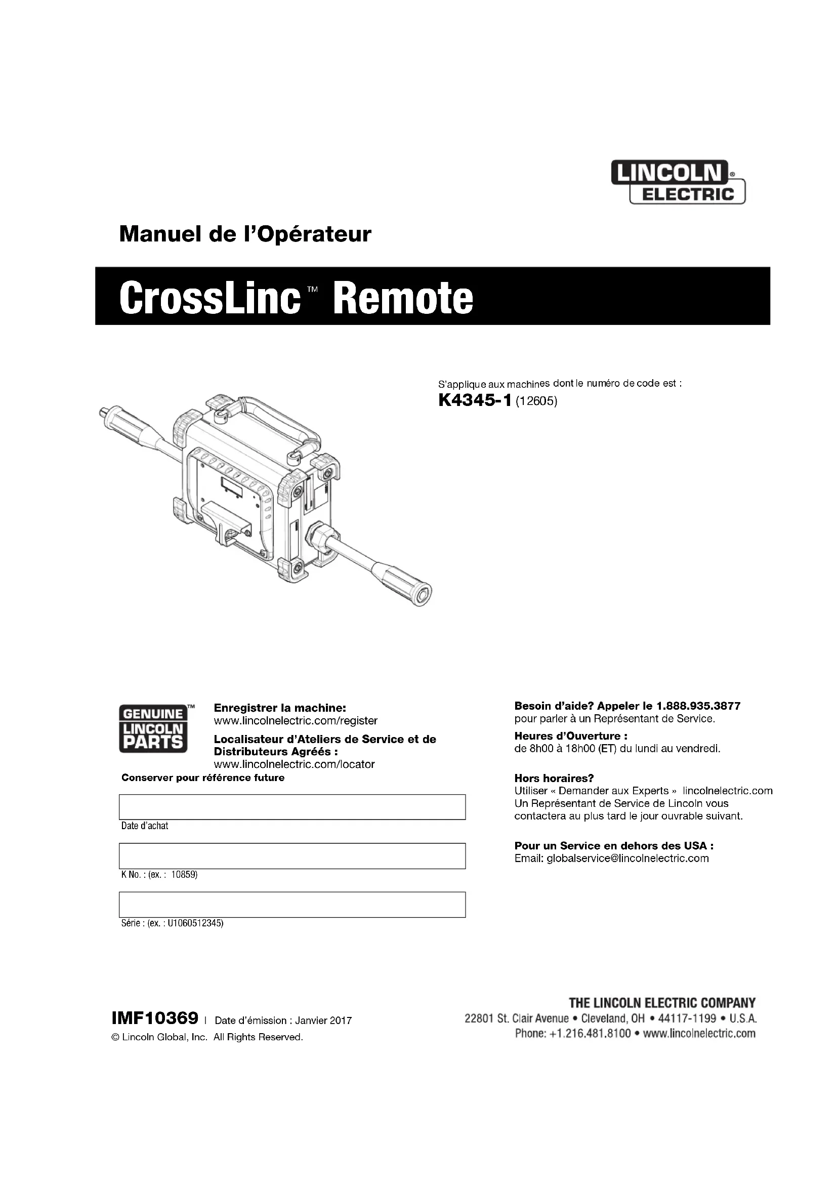 Retrouvez gratuitement la notice de l'appareil CrossLinc Remote LINCOLN ELECTRIC au format PDF.