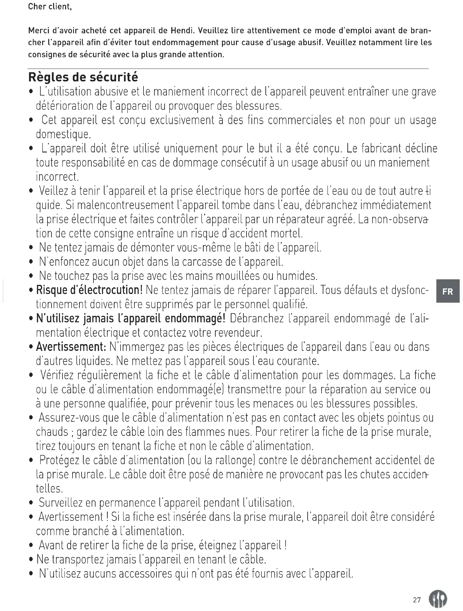 Cher client, Merci d’avoir acheté cet appareil de Hendi. Veuillez lire attentivement ce mode d’emploi avant de bran- cher l’appareil afin d’éviter tout endommagement pour cause d’usage abusif. Veuillez notamment lire les consignes de sécurité avec la plus grande attention. Règles de sécurité