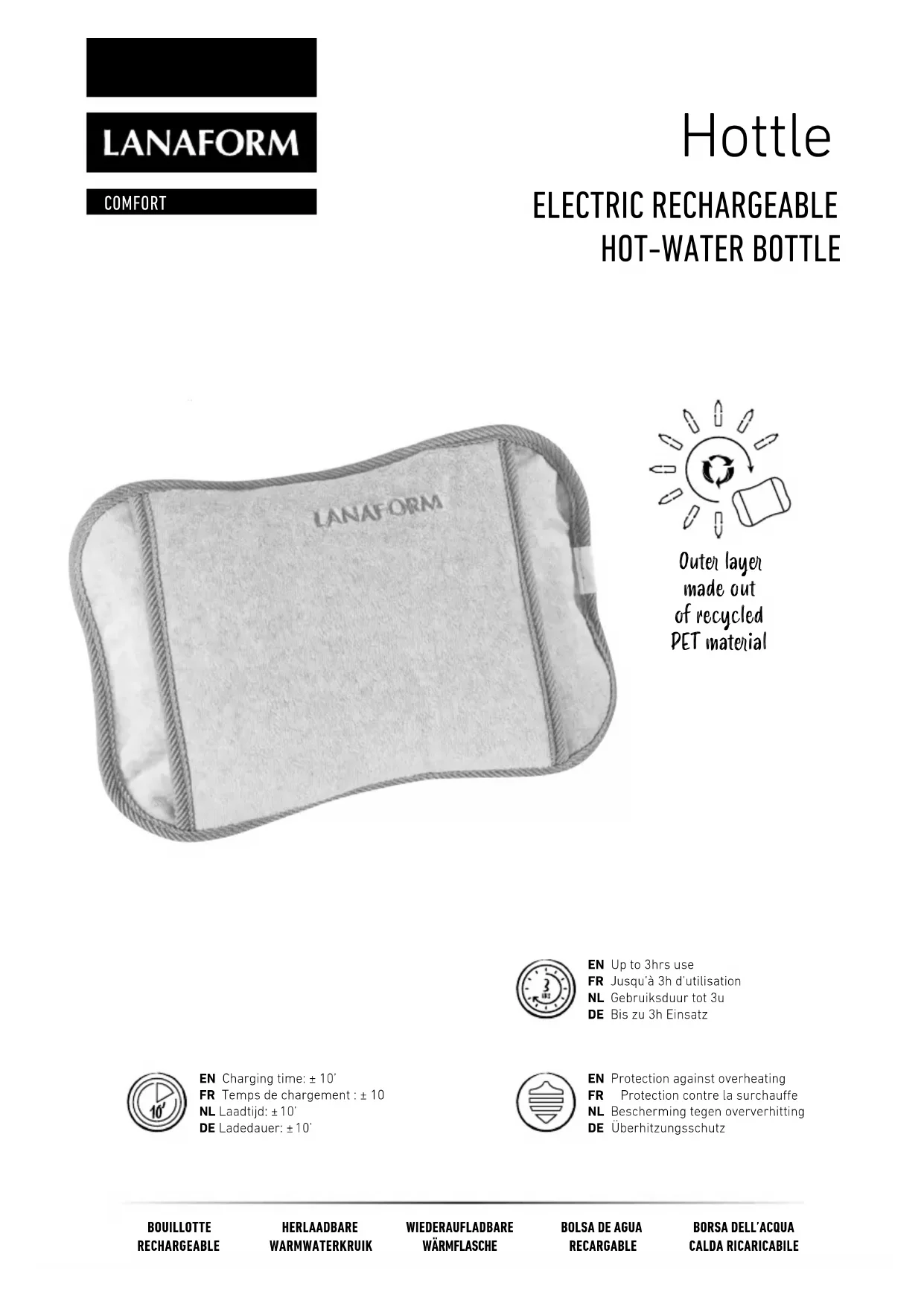 LANAFORM garantit que ce produit est exempt de tout vice de matériau et de fa- brication à compter de sa date d’achat et ce pour une période de deux ans, à l’exception des précisions ci-dessous. La garantie LANAFORM ne couvre pas les dommages causés suite à une usure normale de ce produit. En outre, la garantie sur ce produit LANAFORM ne couvre pas les dom- mages causés à la suite de toute utilisation abusive ou inappropriée ou encore de tout mauvais usage, accident, xation de tout ac- cessoire non autorisé, modication apportée au produit ou de toute autre condition, de quelle que nature que ce soit, échappant au contrôle de LANAFOR. LANAFORM ne sera pas tenue pour respon- sable de tout type de dommage accessoire, consécutif ou spécial. Toutes les garanties implicites d’aptitude du produit sont limitées à une période de deux années à compter de la date d’achat initiale pour autant qu’une copie de la preuve d’achat puisse être présentée. Dès réception, LANAFORM réparera ou remplacera, suivant le cas, votre appareil et vous le renverra. La garantie n’est eec- tuée que par le biais du Centre Service de LANAFORM. Toute activité d’entretien de ce produit conée à toute personne autre que le Centre Service de LANAFORM annule la présente garantie. NEDERLANDS Bedankt voor uw aankoop van de elektrische waterkruik van LANAFORM. Deze handige en gebruiksvriendelijke kruik houdt u urenlang heerlijk warm na slechts enkele minuten la- den. Dankzij haar superieure beveiliging kunt u ze in alle veiligheid gebruiken. Tot slot bestaat de hoes van deze warmte- kruik voor gedeeltelijk uit materiaal waarvan de vezels afkomstig zijn van gerecycleerd PET-materiaal, op basis van plastic essen.