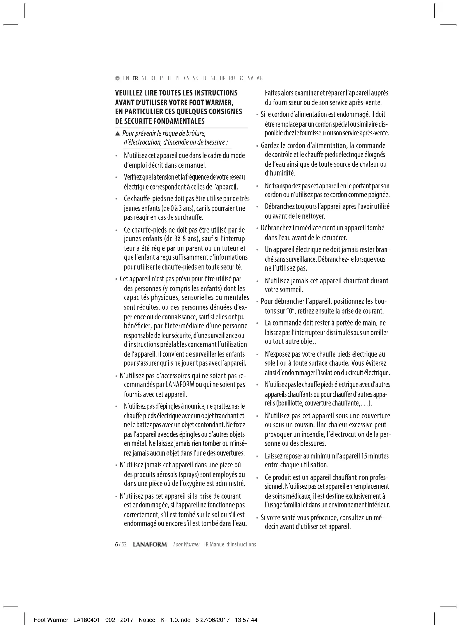 - Si votre santé vous préoccupe, consultez un mé- decin avant d’utiliser cet appareil. Foot Warmer - LA180401 - 002 - 2017 - Notice - K - 1.0.indd 6 27/06/2017 13:57:44Foot Warmer FR Manuel d’instructions 7 / 52 EN FR NL DE ES IT PL CS SK HU SL HR RU BG SV AR