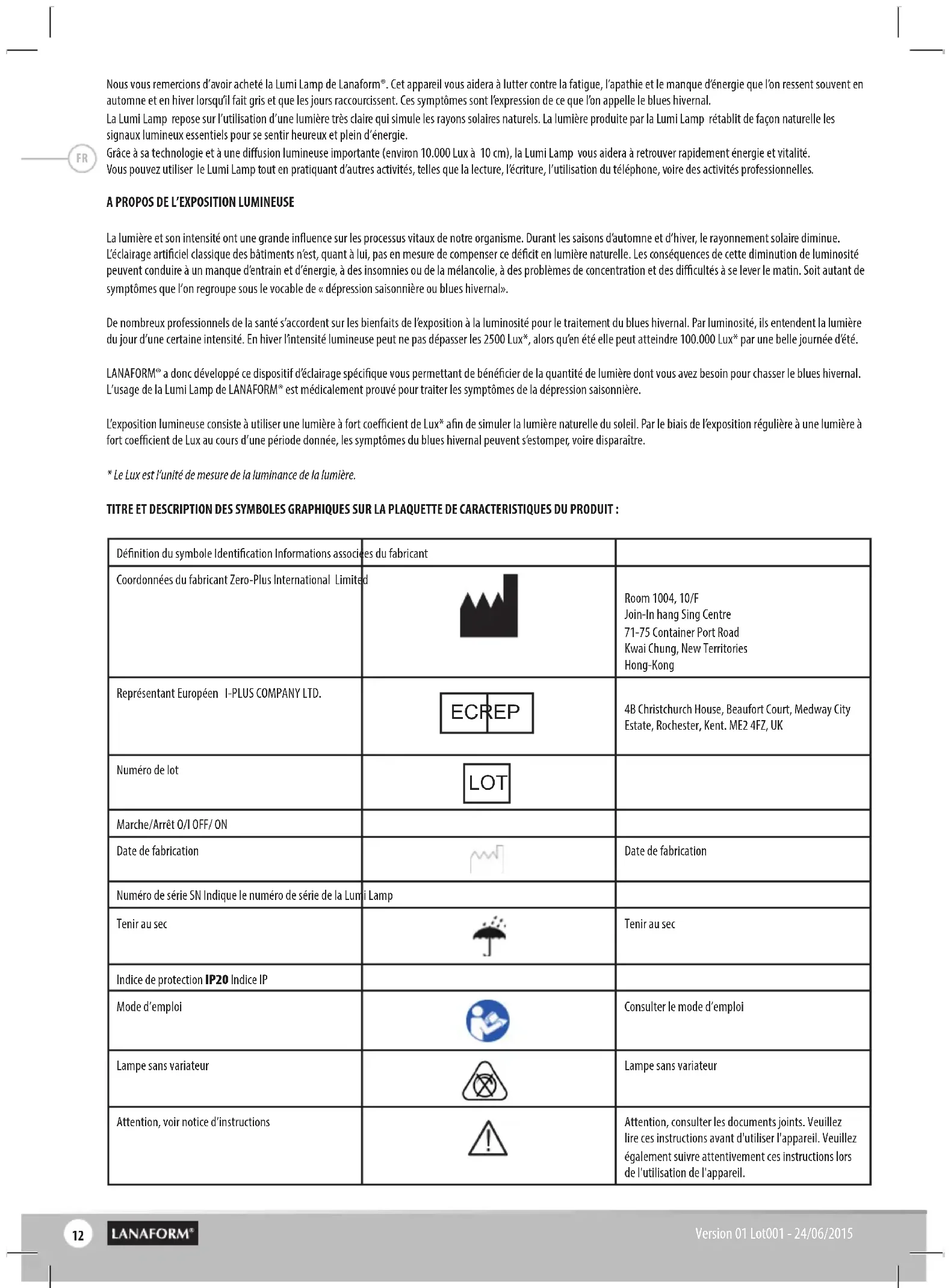 Medical device Category IIa. We, the company LANAFORM, hereby declare that the “Lumi Lamp 001” medical device complies with European Directive 93/42/EC concerning medical devices and its most recent amendment 2007/47/EC. CONTACT INFORMATION The device is manufactured by: Zero-Plus International Limited Room 1004, 10/F., Join-In Hang Sing Centre, 71-75 Container Port Road, Kwai Chung, New Territories, Hong Kong The device is distributed by: Lanaform SA Rue de La légende 55, B-4141 Belgium Authorised European representative: I-Plus Company Ltd. 4B Christchurch House, Beaufort Court, Medway City Estate, Rochester, Kent. ME2 4FZ, UK EN12 Version 01 Lot001 - 24/06/2015 Nous vous remercions d’avoir acheté la Lumi Lamp de Lanaform®. Cet appareil vous aidera à lutter contre la fatigue, l’apathie et le manque d’énergie que l’on ressent souvent en automne et en hiver lorsqu’il fait gris et que les jours raccourcissent. Ces symptômes sont l’expression de ce que l’on appelle le blues hivernal. La Lumi Lamp repose sur l’utilisation d’une lumière très claire qui simule les rayons solaires naturels. La lumière produite par la Lumi Lamp rétablit de façon naturelle les signaux lumineux essentiels pour se sentir heureux et plein d’énergie. Grâce à sa technologie et à une diusion lumineuse importante (environ 10.000 Lux à 10 cm), la Lumi Lamp vous aidera à retrouver rapidement énergie et vitalité. Vous pouvez utiliser le Lumi Lamp tout en pratiquant d’autres activités, telles que la lecture, l’écriture, l’utilisation du téléphone, voire des activités professionnelles.