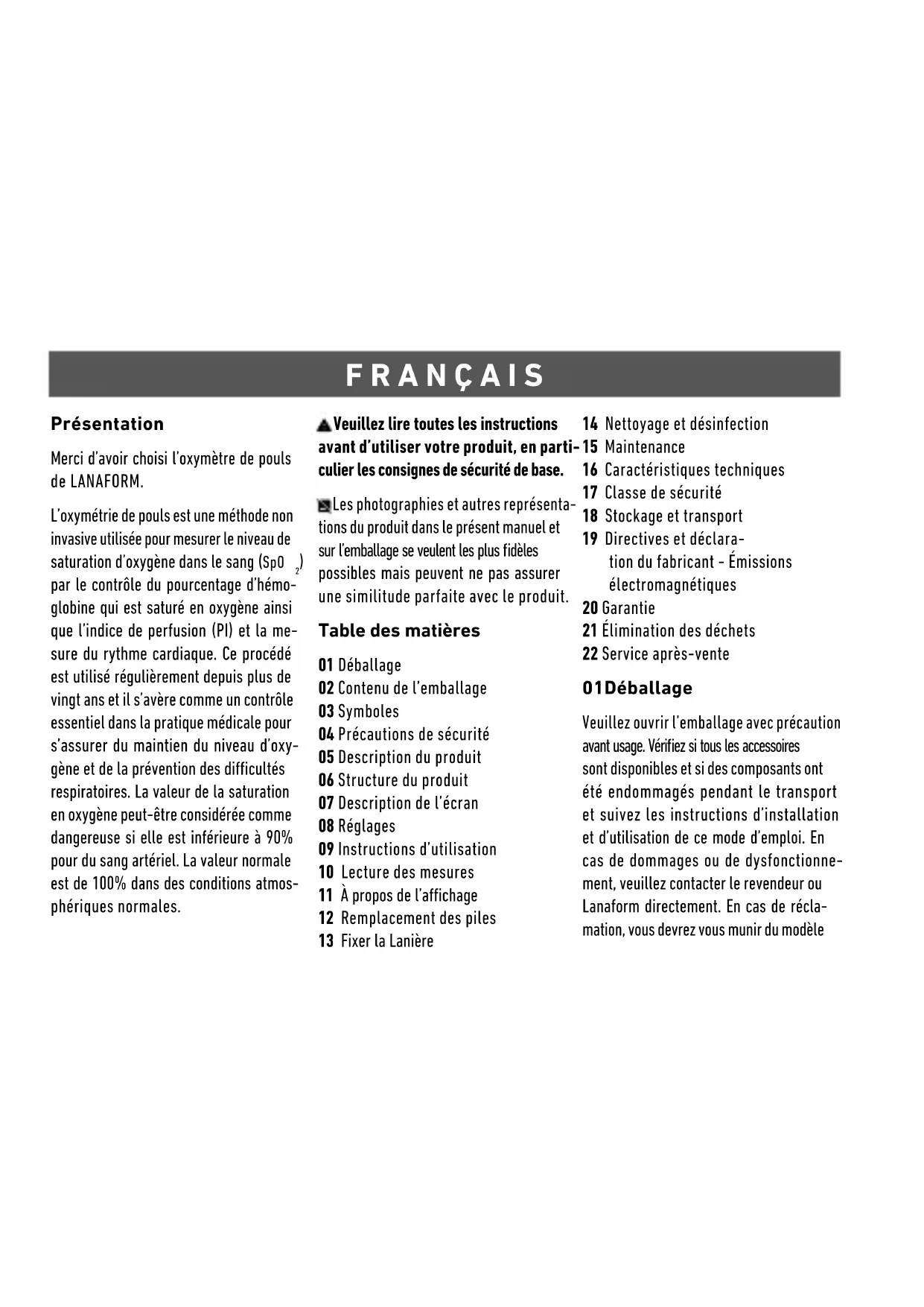 par le contrôle du pourcentage d’hémo- globine qui est saturé en oxygène ainsi que l’indice de perfusion (PI) et la me- sure du rythme cardiaque. Ce procédé est utilisé régulièrement depuis plus de vingt ans et il s’avère comme un contrôle essentiel dans la pratique médicale pour s’assurer du maintien du niveau d’oxy- gène et de la prévention des dicultés respiratoires. La valeur de la saturation en oxygène peut-être considérée comme dangereuse si elle est inférieure à 90% pour du sang artériel. La valeur normale est de 100% dans des conditions atmos- phériques normales. Veuillez lire toutes les instructions avant d’utiliser votre produit, en parti- culier les consignes de sécurité de base. Les photographies et autres représenta- tions du produit dans le présent manuel et sur l’emballage se veulent les plus dèles possibles mais peuvent ne pas assurer une similitude parfaite avec le produit. Table des matières 01 Déballage 02 Contenu de l’emballage 03 Symboles 04 Précautions de sécurité 05 Description du produit 06 Structure du produit 07 Description de l’écran 08 Réglages 09 Instructions d’utilisation 10 Lecture des mesures 11 À propos de l’achage 12 Remplacement des piles 13 Fixer la Lanière 14 Nettoyage et désinfection 15 Maintenance 16 Caractéristiques techniques 17 Classe de sécurité 18 Stockage et transport 19 Directives et déclara- tion du fabricant - Émissions électromagnétiques 20 Garantie 21 Élimination des déchets 22 Service après-vente 01 Déballage Veuillez ouvrir l’emballage avec précaution avant usage. Vériez si tous les accessoires sont disponibles et si des composants ont été endommagés pendant le transport et suivez les instructions d’installation et d’utilisation de ce mode d’emploi. En cas de dommages ou de dysfonctionne- ment, veuillez contacter le revendeur ou Lanaform directement. En cas de récla- mation, vous devrez vous munir du modèlede l’appareil, du numéro de série, de la date d’achat, de vos coordonnées et de votre adresse. 02 Contenu de l’emballage