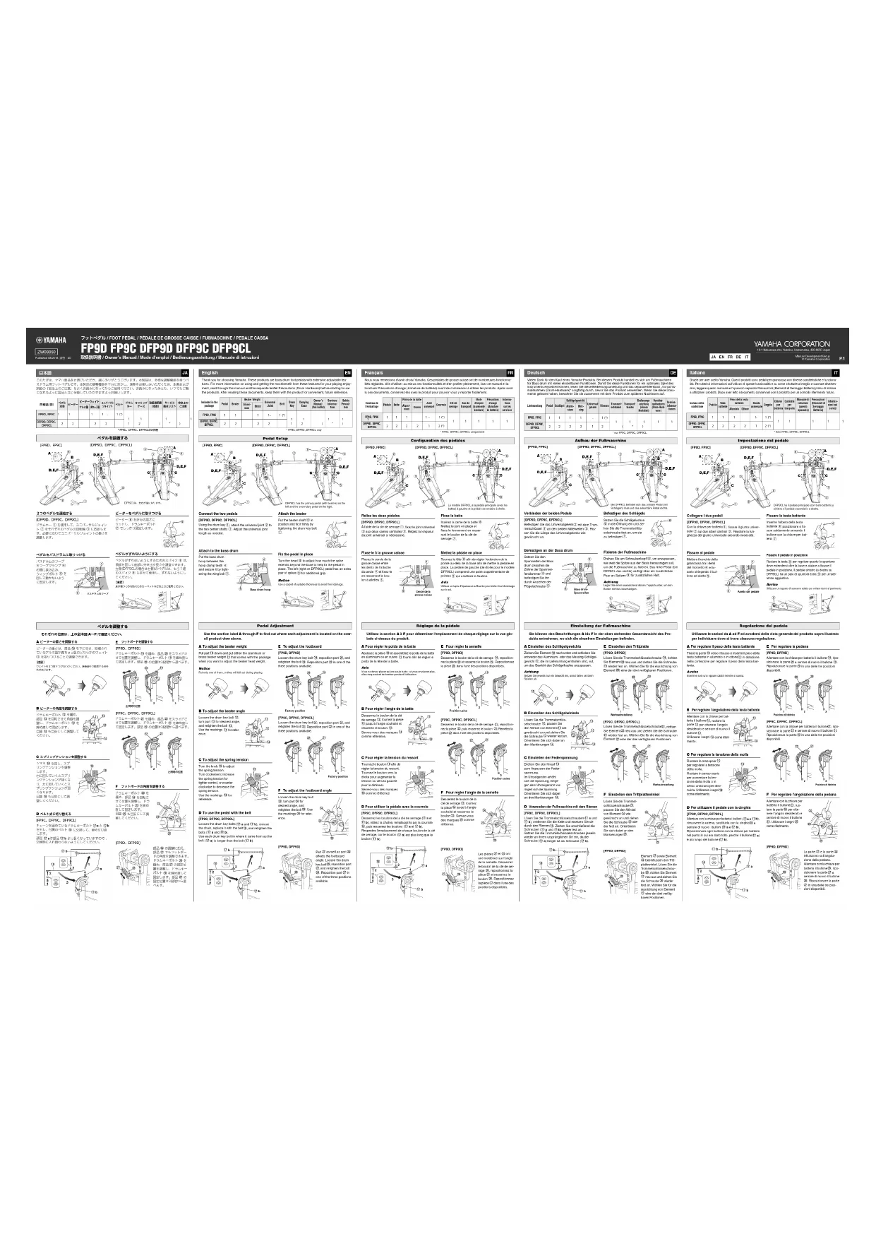 Mettez la pédale en place Tournez la tête i afin de régler l'extension de la pointe au-delà de la base afin de mettre la pédale en place. La pédale de gauche (de droite pour le modèle DFP9CL) comprend une paire supplémentaire de pointes o qui améliore la fixation. Avis Utilisez un tapis d'épaisseur suffisante pour éviter tout dommage sur le sol.Contenu del'emballagePédale BattePoids de la batteJoint universelCourroieClé de serrageSac de transportMode d'emploi(la présente brochure)Précautions d'usage (Armature de batterie)Informa-tionssur les servicesAlumi- nium CuivreFP9D, FP9C11 1 1