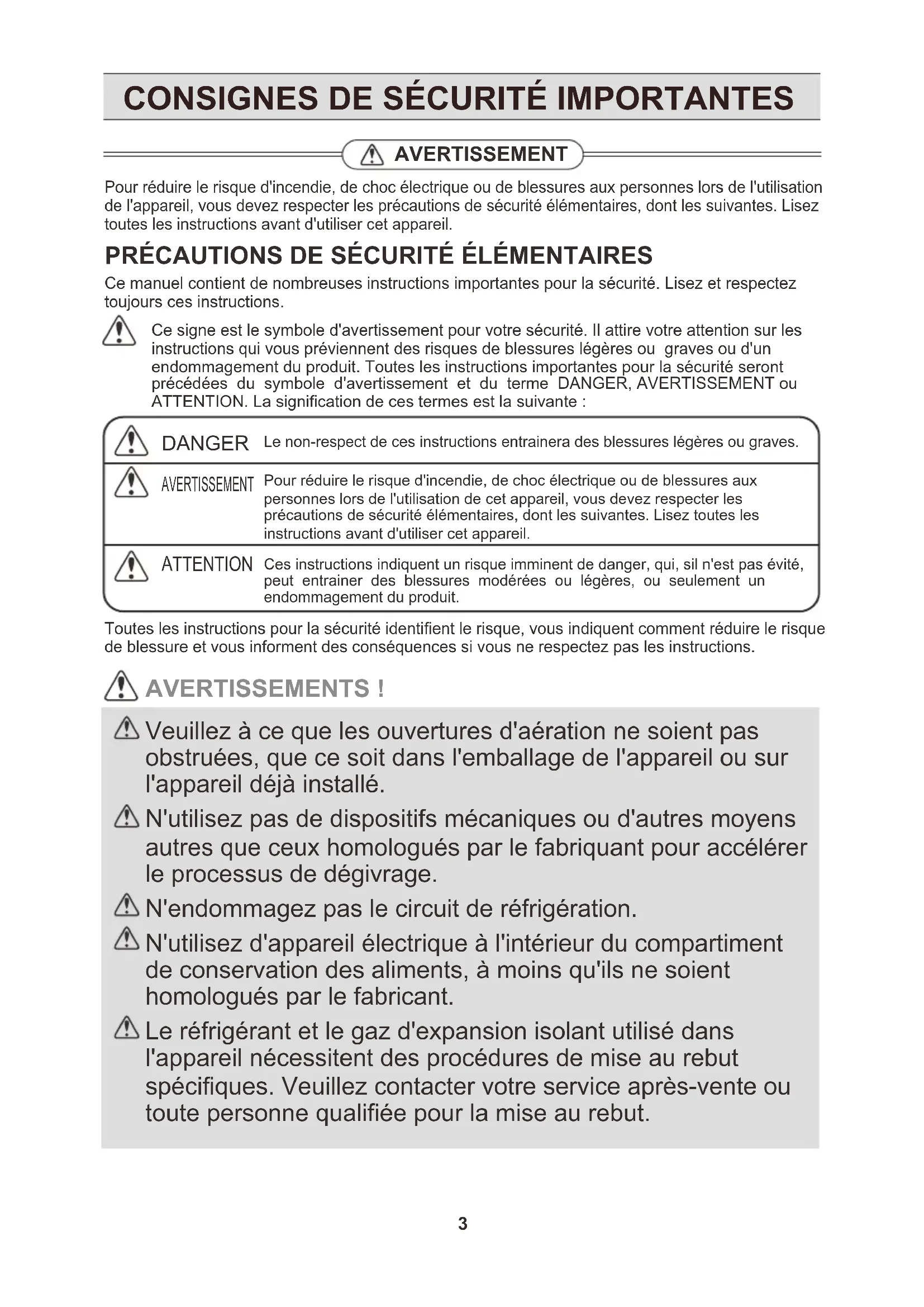 Alarme de Porte (en option) Contrôles Du Compartiment Congélateur Commandes Du Compartiment De Réfrigération Contrôleur d'humidité Remplacement de la lampe VacancesCONSIGNES DE SÉCURITÉ IMPORTANTES Veuillez à ce que les ouvertures d'aération ne soient pas obstruées, que ce soit dans l'emballage de l'appareil ou sur l'appareil déjà installé. N'utilisez pas de dispositifs mécaniques ou d'autres moyens autres que ceux homologués par le fabriquant pour accélérer le processus de dégivrage. N'endommagez pas le circuit de réfrigération. N'utilisez d'appareil électrique à l'intérieur du compartiment de conservation des aliments, à moins qu'ils ne soient homologués par le fabricant. Le réfrigérant et le gaz d'expansion isolant utilisé dans l'appareil nécessitent des procédures de mise au rebut spécifiques. Veuillez contacter votre service après-vente ou toute personne qualifiée pour la mise au rebut. AVERTISSEMENTS ! PRÉCAUTIONS DE SÉCURITÉ ÉLÉMENTAIRES Ce manuel contient de nombreuses instructions importantes pour la sécurité. Lisez et respectez toujours ces instructions. Ce signe est le symbole d'avertissement pour votre sécurité. Il attire votre attention sur les instructions qui vous préviennent des risques de blessures légères ou graves ou d'un endommagement du produit. Toutes les instructions importantes pour la sécurité seront précédées du symbole d'avertissement et du terme DANGER, AVERTISSEMENT ou ATTENTION. La signification de ces termes est la suivante : DANGER AVERTISSEMENT ATTENTION Le non-respect de ces instructions entrainera des blessures légères ou graves.Pour réduire le risque d'incendie, de choc électrique ou de blessures aux personnes lors de l'utilisation de cet appareil, vous devez respecter les précautions de sécurité élémentaires, dont les suivantes. Lisez toutes les instructions avant d'utiliser cet appareil.Ces instructions indiquent un risque imminent de danger, qui, sil n'est pas évité, peut entrainer des blessures modérées ou légères, ou seulement un endommagement du produit. Toutes les instructions pour la sécurité identifient le risque, vous indiquent comment réduire le risque de blessure et vous informent des conséquences si vous ne respectez pas les instructions. AVERTISSEMENT Pour réduire le risque d'incendie, de choc électrique ou de blessures aux personnes lors de l'utilisation de l'appareil, vous devez respecter les précautions de sécurité élémentaires, dont les suivantes. Lisez toutes les instructions avant d'utiliser cet appareil.
